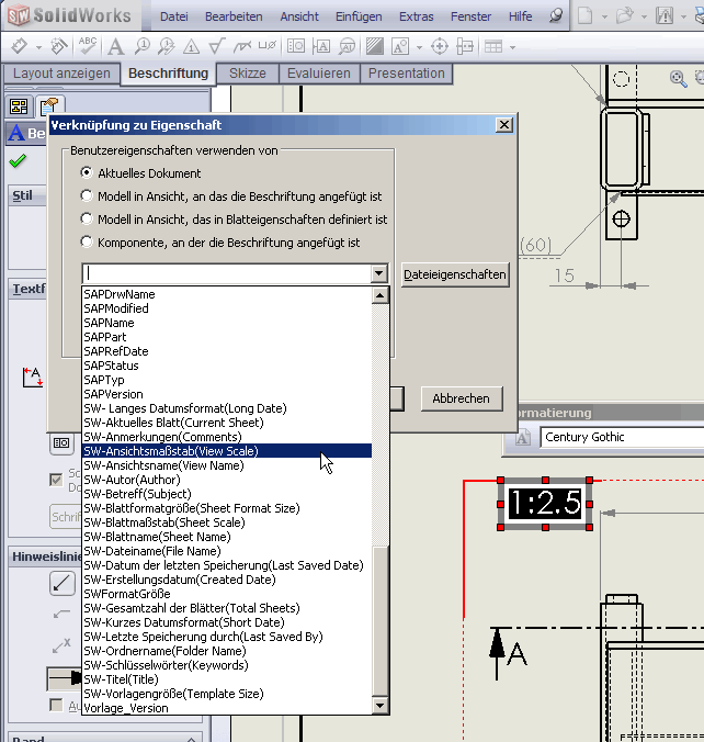 Zitat: Original erstellt von StefanBerlitz: Sieht aber so aus, als hätten sich mittlerweile genügend Viele, die die Idee und den Wunsch hatten,auch bei SolidWorks gemeldet - in der SW2010 findet man endlich die asoziative Verknüpfung zum Ansichtsmaßstab.