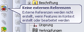 Hallo Tanita, Ob ein Teil, welches in der Baugruppe verbaut ist, oder ein Feature von einem Teil eine externe Referenz hat, kannst du ganz leicht feststellen. Am Ende von der Teilebeschreibung ist ein -> zu sehen, das gleiche gilt für das Feature. Bei deiner Abfrage sieht man klar, dass das Teil kein -> am Ende hat, und es somit keine Externen Referenzen in diesem Teil ist. Sind die externen Referenzen gebrochen, ändert das -> auf ->x In der Version 2009 hab ich gesehen, dass man sich auf sperren kann, sieht dann so ->* aus. Sehe gerade, Stefan war schneller....... Zitat: HaPe Du hast das Icon "Keine externen Referenzen" aktiviert,....