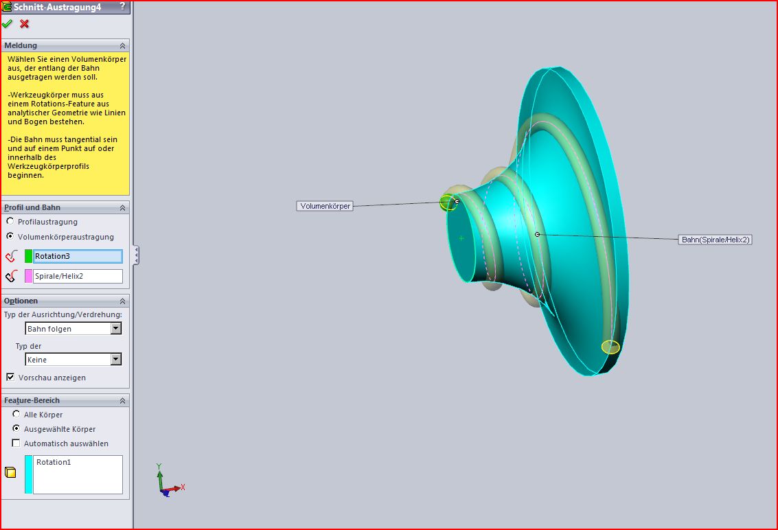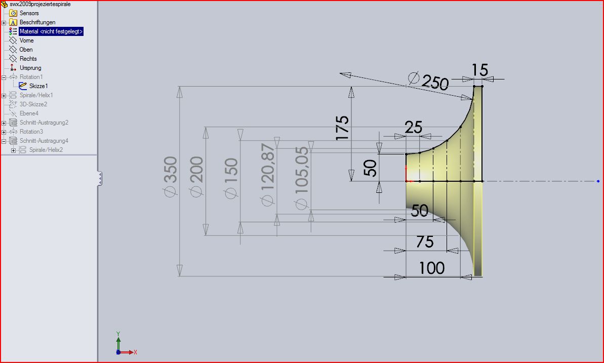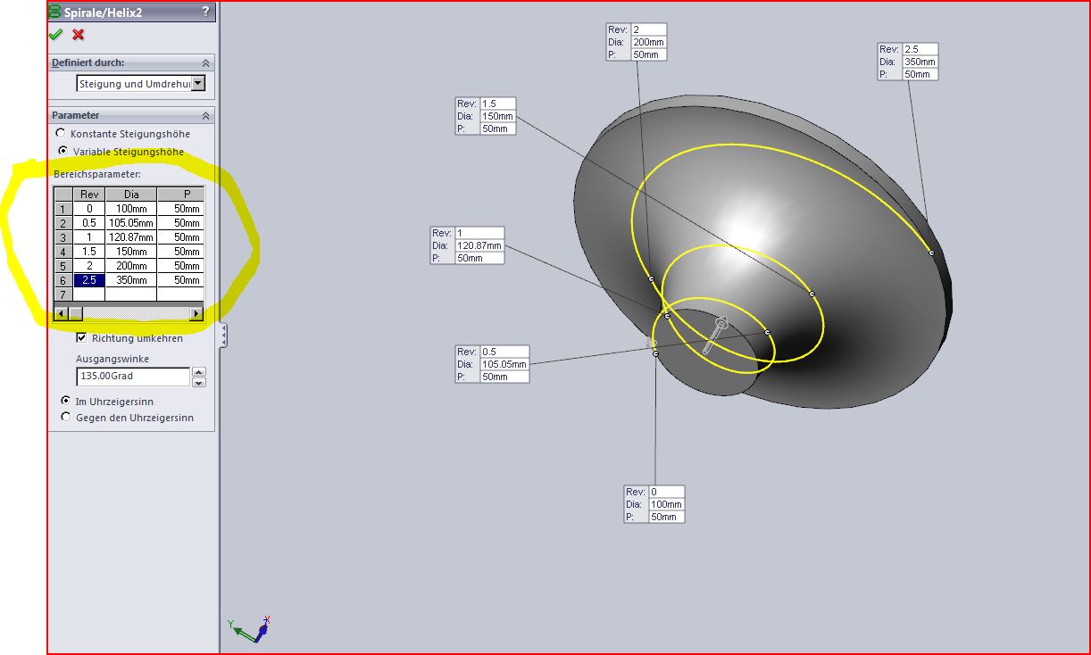 Hallo, ich muss in SolidWorks 2008 eine Spirale konstruieren, die keine lineare Verjüngung (bessergesagt ist es eine Aufweitung) besitzt, sondern bei der die Verjüngung durch eine quadratische Funktion gegeben ist. Diese Spirale ist dann die Leitkurve für eine Austragung. Zur Anschauung habe ich mal ein Beispielbild gebastelt. Auf der gekrümmten Mantelfläche soll zB eine Nut entlanggeschraubt werden Ich habe schon ein wenig hier gestöbert. Ist es richtig, dass ich die Spirale nur durch einen XYZ-Punkte-Spline mit zu Grunde liegender Excel-Tabelle annähern kann, oder gibt es eine andere, elegantere Lösung? Danke schonmal für die Antworten, Grüße Eine Antwort auf diesen Beitrag verfassen (mit Zitat/Zitat des Beitrags) IP |