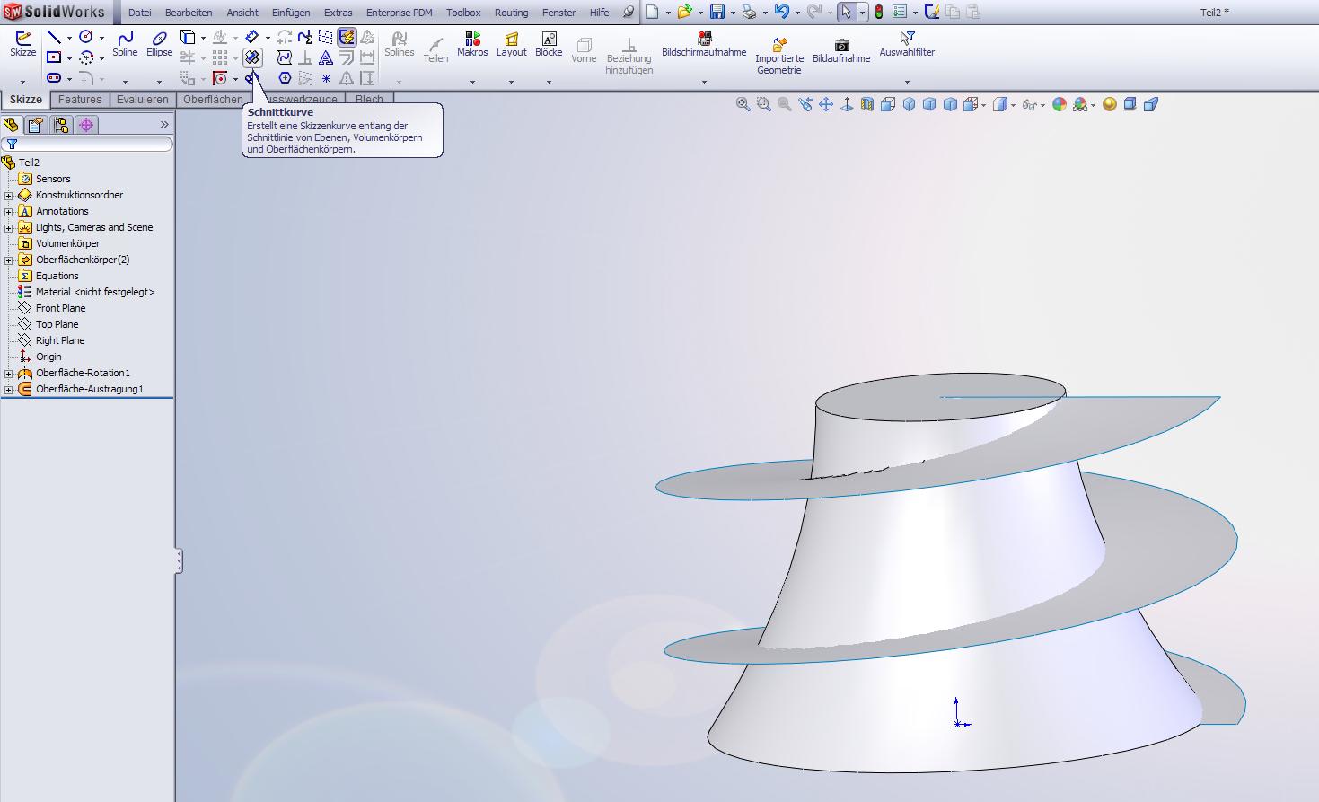 Ich würde mit dems Skizzierwerkzeug Schnittkurve erstellen eine Bahn auf der Mantelfläche erzeugen. Ich hänge mal ein Teil mit an. Die schnittkrven werden aus Oberflächen erzeugt,die Skizze von dem Solid habe ich aus dem Flächenmodell übernommen! Bitte fülle dein Profil noch aus,kann sein das du mein Teil nicht aufbekommst,(2009)!,dann habe ich mir unnötig Arbeit gemacht, und das wollen wir vermeiden!