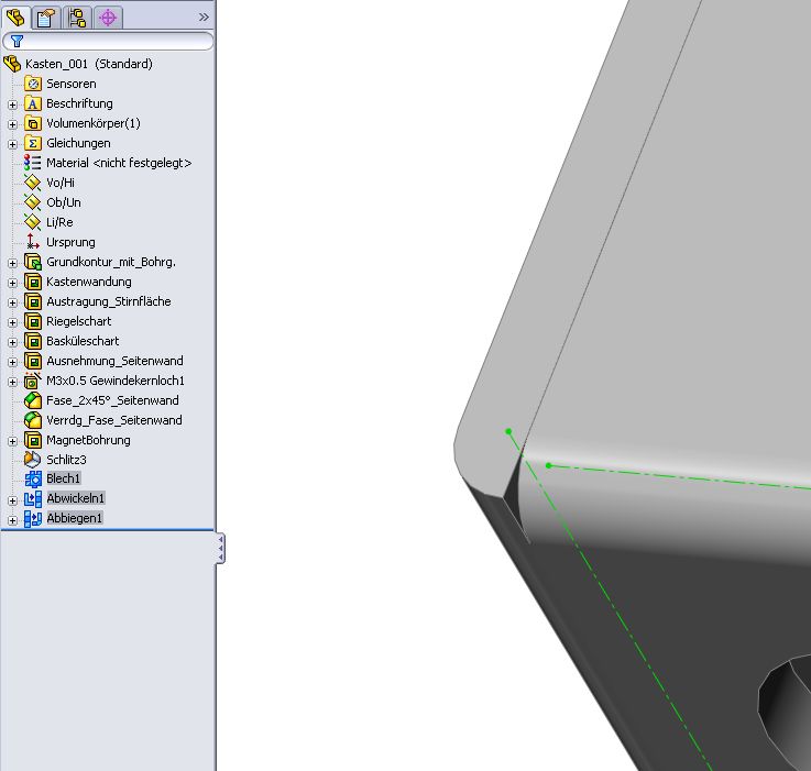 Hi Cawi, ich nehme an, dass das missbrauchte Blechfeature die Ursache deines Unwohlseins ist. Lösche doch mal das Blechfeature, anschließend die Konfiguration DXF-Platine. Jetzt erzeugst du ein neues Blechfeature mit Biegungen einfügen, trägst, deine Biegewerte ein und guckst, ob es dann funktioniert, wie du es benötigst. Dann initialisiert sich auch die Konfiguration für die Abwicklung korrekt. Grüße Günter ------------------ Wie man Fragen richtig stellt Eine Antwort auf diesen Beitrag verfassen (mit Zitat/Zitat des Beitrags) IP |