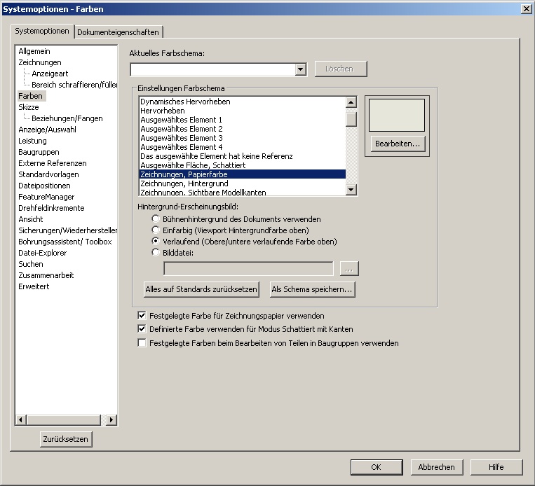 Hallo Forum, dank der Suchfunktion im Forum weiß ich jetzt, wo die Bilddatei für das blöde Knitterpapier gespeichert ist und wie ich vielleicht lustige alternative Bilder als Zeichnungshintergrund bekomme. Aber bitte sagt mir mal, wie ich einen schönen monochromen Hintergrund bekomme (SWX 2008 und 2009) möglichst mit der Papierfarbe die ich in den Systemoptionen eingestellt habe. Vielen Dank, ich verspreche Unities satt!! Andreas Eine Antwort auf diesen Beitrag verfassen (mit Zitat/Zitat des Beitrags) IP |