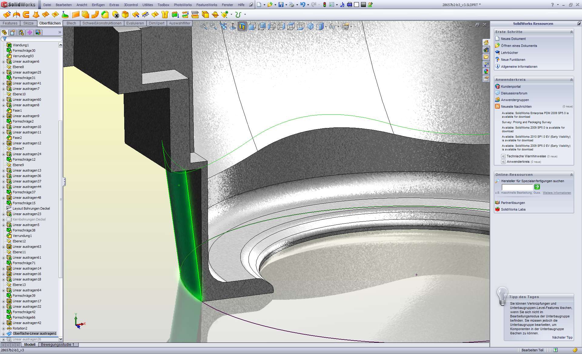 Danke für die Tipps und schnellen Antworten! Der Tipp von GWS mit den getrimmten Oberflächen hat mir weitergeholfen und das gewünschte Resultat erbracht...10Us4U mit einem Volumenkörper hab ich schon alles probiert...und das geht wirklich nicht so wie ich mir das gewünscht hätte...ist eben doch auch ein ziemlich komplexes teil. Danke euch beiden! Gruss Dave ------------------ SolidWorks - Master of Disaster  Eine Antwort auf diesen Beitrag verfassen (mit Zitat/Zitat des Beitrags) IP |