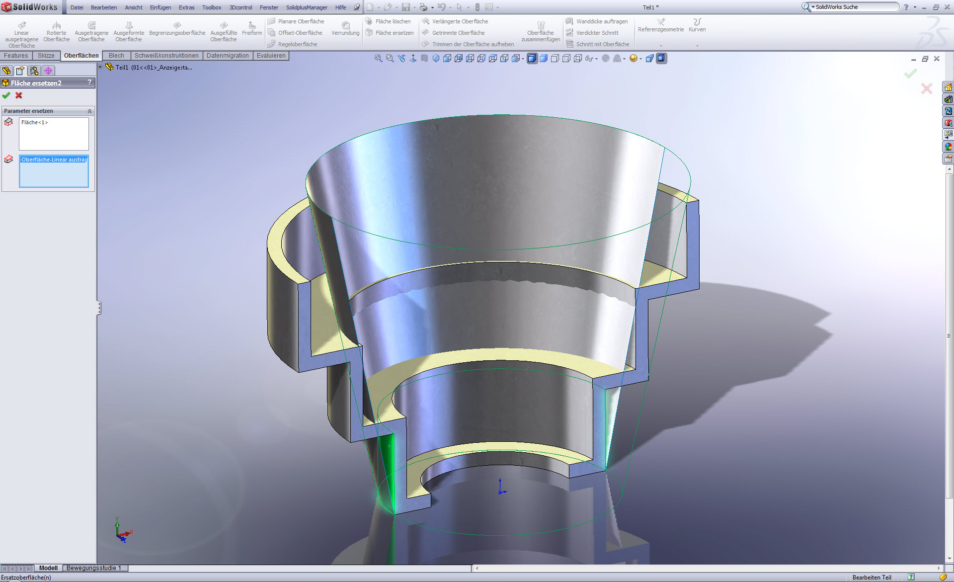 Zitat: .... erzeuge Dir von den beiden anderen Flächen (die Zylinderwand und der Flanschabsatz) einen Flächenoffset von 0 und benutze dann Oberflächen zusammenfügen.