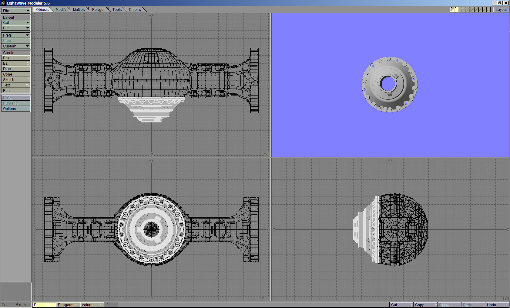 Hallo Erstmal herzlichen Dank für die vielen Antworten. Das brachte bei mir schon ordentlich Licht ins Dunkel. Die CNC-Geschichte ist für mich im Moment abgehakt, ich denke das wird alles so klappen wie gedacht. Anbei ein Bild aus meinem jetzigen Programm Lightwave 3D. Ich arbeite mit Absicht noch mit der fast 10 Jahre alten Version 5.6, da diese für meinen Bereich alles bietet, was ich zum Arbeiten brauche. Aktuelle Version ist dank 1000 neuer Features (die ich nicht brauche) zu sehr überladen und die Performance ist nicht annähernd so gut wie in 5.6. Zum Anhang: Es ist ein Screencapture zweier Teile. Das "schwarze" Teil liegt in Layer2 und ist auf "Sichtbar" geschaltet, allerdings kann ich dieses nicht bearbeiten. In Layer 1 liegt der Deckel, welcher nur Modelliert wird usw.... Layeraktivierung sieht man oben rechts. Unten links erkennt man die Rastergröße des Hintergrundrasters. Die etwas dickeren Linien im Raster zeigen immer das Total - Null des Koordinatensystems auf, dieses wird auch bei Konvertierungen in alle möglichen Formate beibehalten, was zum Teil die Synchronisation mit anderen Teilen deutlich vereinfacht. Soviel zum Anhang. In der Art passe ich alle möglichen Teile aneinander an, das macht die Sache recht einfach und optisch sofort überschaubar. Die Frage ist nun: Geht sowas auch in SW??? Noch ein weiterer Punkt: Das im Vordergrund (weis) zu sehende Teil ist ein Polygonobjekt, also faktisch ein STL, im Hintergrund kann man erahnen, das die Achse selber ein (in Ligtwave "NURBS") Objekt ist, bedeutet: Alle Kanten sind Vektoren die zueinander eine entsprechende Kurve ergeben. Rein 3D-technisch nichts anderes als ein Stepfile. So die Theorie... Der Oberknaller wäre natürlich wenn ein solches File direkt importierbar wäre und man mit "mach mir aus Polygone -> Vektoren" das File in ein SW-File konvertierbar wäre. Aber ich glaub da erhffe ich zuviel.... Nochmals vielen Dank für Eure Hilfe. TOM