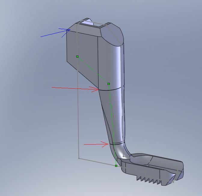 Hallo Caladhras, ich musste das Teil nachträglich auch anders aufbauen, da sich die Radien sonst nicht erstellen ließen. Die seitliche Kontur (grüne Linien erst mal nicht mit wegschneiden, sondern diesen Teil voll austragen und am Ende wegschneiden. Die Fase 2x45° (oben blauer Pfeil) auch erst nach dem Radius anbringen. Die seitlichen Kanten der Schrägen musst du, wie auch erlaubt, mit R0,2mm verrunden (rote Pfeile). Jetzt kannst du die Kante mit RMT anwählen und mit "tangentialität" auswählen. Radien-Feature starten und dort den variablen wählen. Es lisgt nun an dir wie viel Zwischenpunkte du noch setzen möchstet um den mittleren Teil vielleicht noch zu optimieren, aber bei der Standardvorgabe klickst du jetzt einfach im Modellbereich die Eintragsfenster an und nimmst oben R5 und unten R2,25. Ohne Zwischenpunkte musst du aber an einem Übergangspunkt zum schmaleren Bereich (oberer Roter Pfeil) den Radius auf R4,98 verkleinern. Dann sollte das Teil so aussehen wie auf meinem Bild. Wie gesagt, wenn die Radien dran sind, muss du seitlich links noch die schräge Konturen wegnehmen und oben die Fase anbringen. Fehlt das Material vorher, schneidet sich das Teil durch die Feature irgendwo selbst und verweigert den Aufbau. Deine Teile konnte ich mir zum Vergleich hier nicht ansehen, da ich im Moment nur SWX07 greifbar hatte. ------------------ Gruß Thorsten Eine Antwort auf diesen Beitrag verfassen (mit Zitat/Zitat des Beitrags) IP |