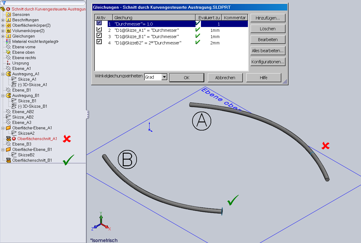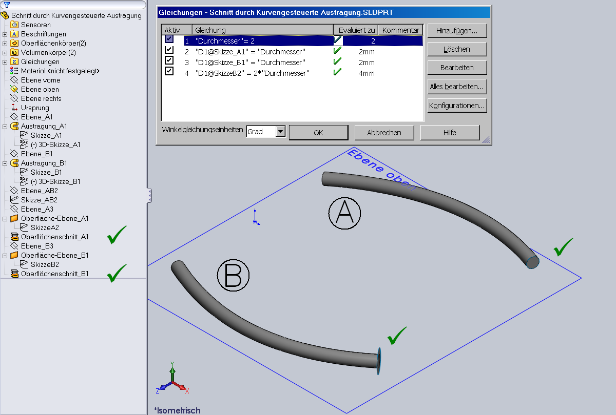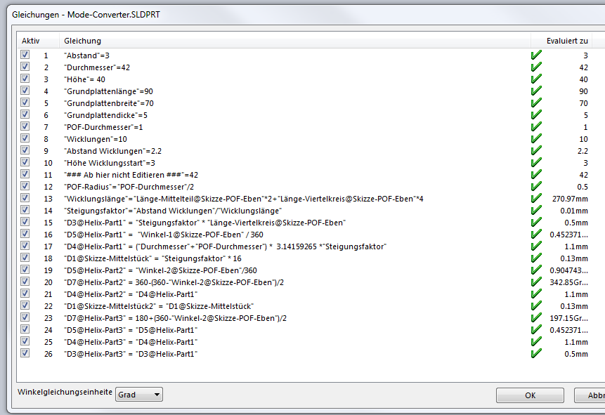 Hallo Guido! vielen Dank Konnte mir das jetzt mal in Ruhe anschauen. Wenn Du in kleinen Bereichen variieren willst klappt das! (hast Du schon mal über eine Beschränkung der Eingabemöglichkeiten in der Gleichung nachgedacht?) Respekt vor Deiner Arbeit! (Bitte nicht falsch verstehen ,ich ziehe meinen Hut ) Aber Geometrisch bin ich auf das übliche SWX Problem gestoßen! Klick mal Deine Endkanten der Austragungen an, mal kommt ein Durchmesser (wirklich Rund) dabei heraus manchmal nur ein Bogenmaß. Du hast es aber unter die magische Grenze von 0,0001 mm genau geschafft. Das hier bleibt wohl noch geraume Zeit in meinem Hinterkopf bin mit der Kurve durch XYZ Punkte (erste Antwort ) noch nicht fertig. (Bezüglich was lässt sich einfacher durch eine Gleichung steuern) MfG Andreas