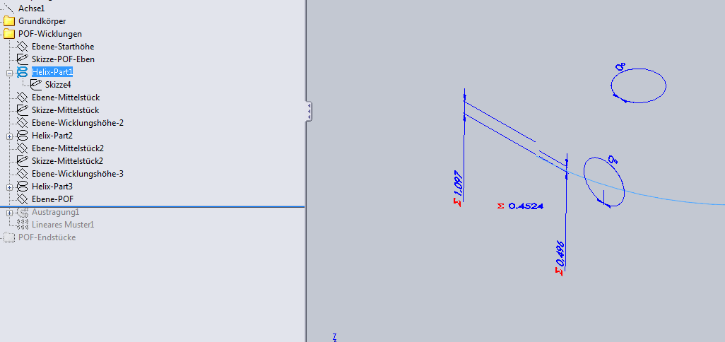 nachdem ich noch einige Zeit in die Wicklung gesteckt habe ist sie nun fertig. Ehrlich gesagt bin ich mit der jetzigen Lösung auch nicht 100% zufrieden aber ich habe momentan keinen besseren Ansatz. Das wohl größte Problem bei der Sache ist, dass die Parameter der Wicklung einstellbar sein sollen. Eine Sache ist mir noch aufgefallen, die ich hier abschließend erwähnen möchte: Die ursprünglichen Enden der Wicklung habe ich mittels Oberflächenschnitt abgeschnitten und dann über ein 3D-Spline weiter ausgetragen. Beim Schnitt durch die Wicklung habe ich zunächst die Schnittkurve zwischen einer Referenzebene und der Wicklung bestimmt. Danach habe ich aus der Schnittkurve eine Ebene erzeugt und mit dieser Ebene die Wicklung am Ende abgeschnitten (vergl. Teil A in "Oberflaechenschnitt_OK.PNG"). Wird der Durchmesser der Wicklung über die entsprechende Variable verkleinert tritt jedoch ein Fehler auf (vergl. Teil A in "Oberflaechenschnitt_Fehler.PNG"). Die Ursache hierfür ist wohl nur SWX bekannt. Es ist folglich ratsam den Durchmesser der Schnittfläche entsprechend zu vergrößern (vergl. Teil B in "Oberflaechenschnitt_OK.PNG" bzw. "Oberflaechenschnitt_Fehler.PNG"). Mit freundlichen Grüßen Guido