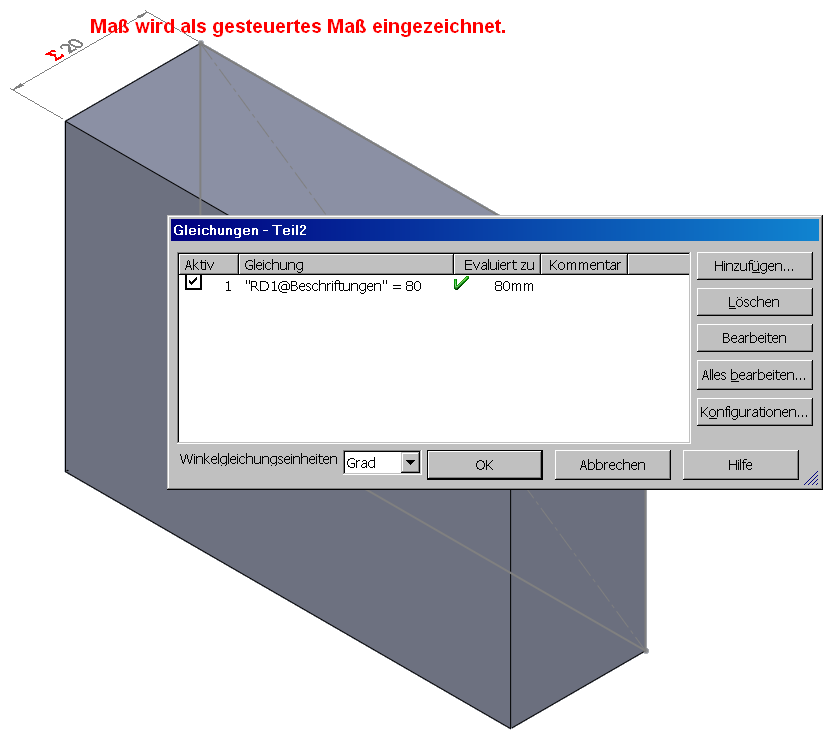 hmm, falls ich das Bild nicht falsch interpretiert habe: ich nehme mal an SW verhaelt sich in diesem Fall aehnlich wie andere CAD: ein *gesteuertes* Mass (20) kann nicht per Variable geaendert werden, wird sein Wert doch von einem anderen Mass bestimmt. Ein *steuerndes* Mass kann jedoch per Variable geaendert werden. Klaus [Diese Nachricht wurde von modeng am 16. Jan. 2010 editiert.] Eine Antwort auf diesen Beitrag verfassen (mit Zitat/Zitat des Beitrags) IP |