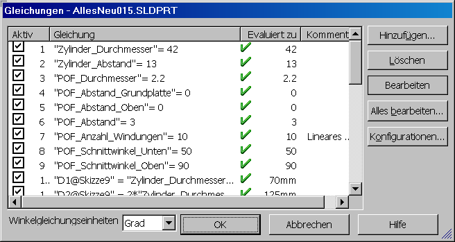 Hallo Guido, klick doch einfach mal doppelt auf deine Lineare Austragung - dann bekommst du die Maße der Skizze in Schwarz und das Maß der Höhe in blau angezeigt. Dieses kannst du nun anklicken um es mit einer Variabelen oder Gleichung zu verknüpfen. Edit: Die Helix kann man übrigens auch schon in SWX2009 mit einer Gleichung steuern  Das ganze über schräge Flächen zu machen ist nun mal nicht genau. ------------------ Dirk