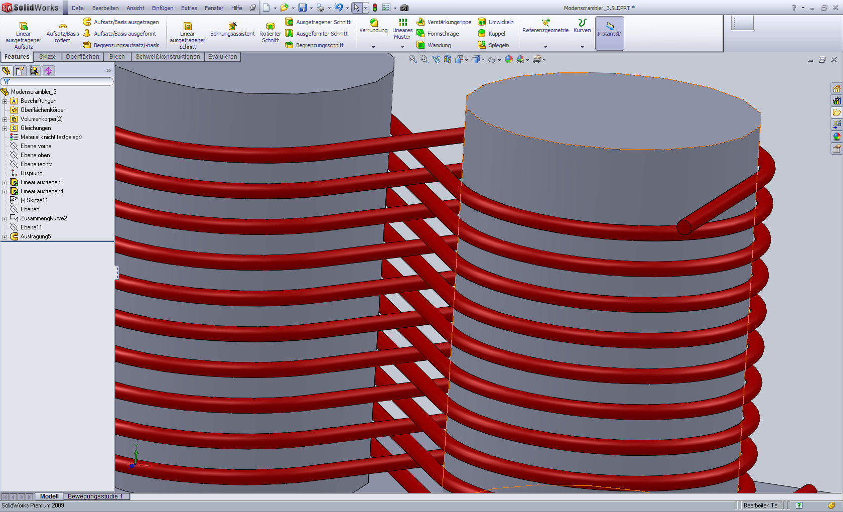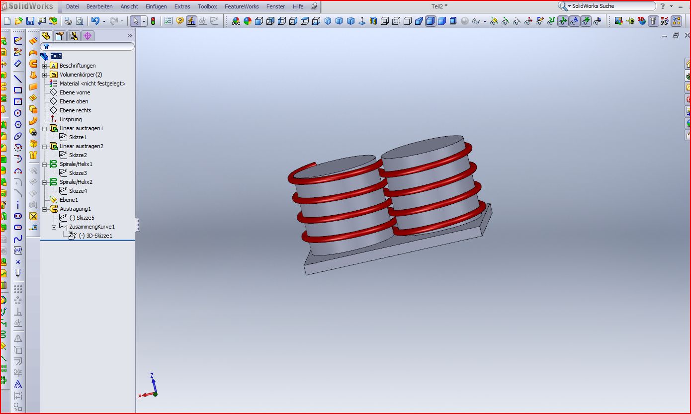 Hallo Dirk, sieht gut aus. Leider kann ich SWX 2010 nicht öffnen.  Erstellst Du eine Skizze für alle Windungen und trägst sie dann aus? In diesem Fall kann es sein, dass Du lediglich noch etwas mit den Optionen beim Austragen "spielen" musst. Vielleicht hilft auch das Feature zusammengesetzte Kurve. Erzeugst Du die 3D-Skizzen über 2D-Skizzen die Du mit Gleichungen steuerst? Mit freundlichen Grüßen Guido Eine Antwort auf diesen Beitrag verfassen (mit Zitat/Zitat des Beitrags) IP |