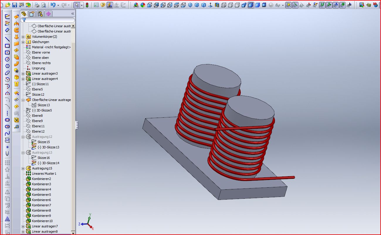Dies ist mir auch aufgefallen. Ich denke daher kommen auch die von mir weiter oben beschriebenen Probleme beim Abschneiden der Wicklung. Ich werde das Modell -falls möglich- noch etwas vereinfachen und mich dann an die entsprechende Dokumentation machen. Sonst gibt's noch Ärger. Für meinen Anwendungsfall sollte das Modell genügen. Der Ansatz mit der Kurve durch XYZ Punkte ist interessant allerdings fehlt mir hierfür das SWX-Wissen. Ich werde ihn auf jeden Fall im Hinterkopf behalten und in einer ruhigen Minute herauskramen um mir damit das entsprechende Wissen anzueignen. @all Ich bedanken mich nochmals bei allen die mich bei der Konstruktion des Modells unterstützt habe. Vor allen Dingen bei Andreas, dessen unermüdliche Hilfsbereitschaft eine echte Bereicherung für dieses Forum ist! Mit freundlichen Grüßen Guido