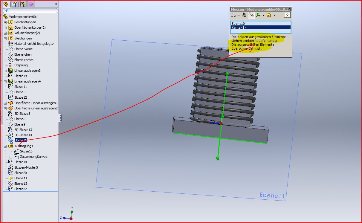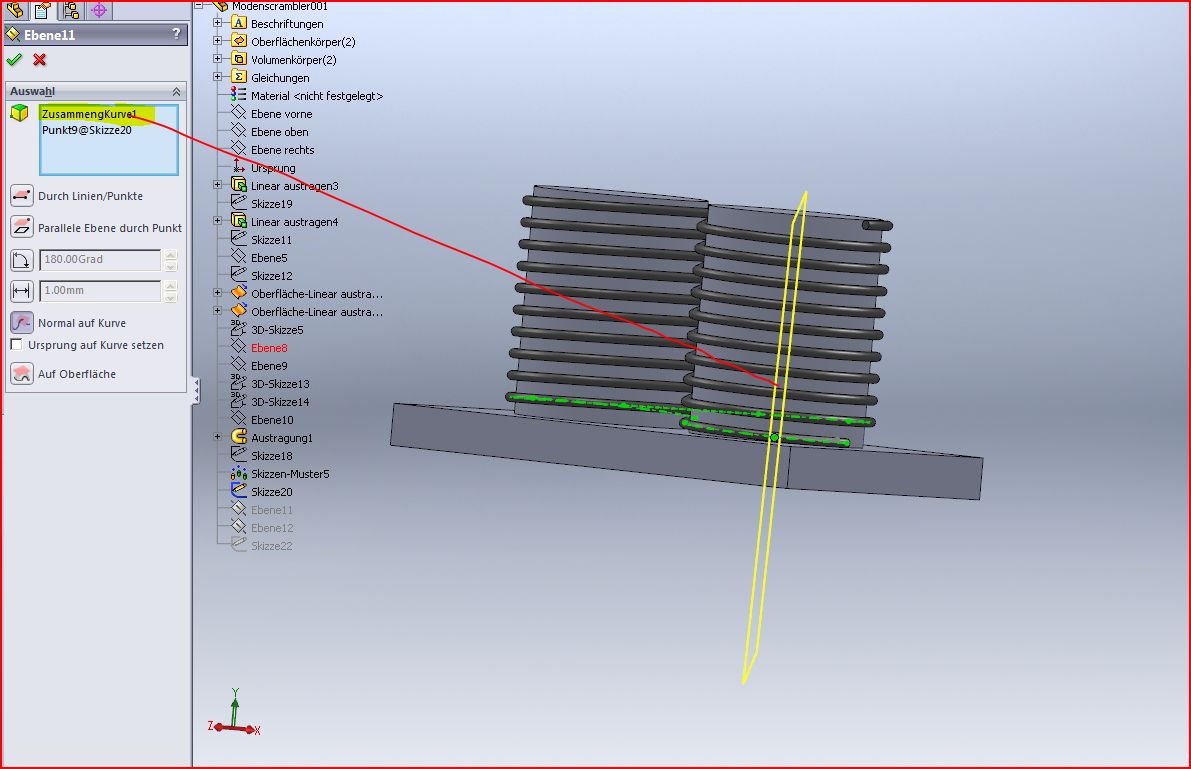 Dank Deiner Hilfe ist es mir gelungen senkrecht zur Wicklung zwei Schnittebenen an der richtigen Stelle einzufügen. Mit anderen Worten ich muss mir über die Steigung keine Gedanken machen.  Wie schneide ich die Wicklung am besten ab? Habe ich dies in "Modenscrambler001.zip" sinnvoll gelöst? Mit freundlichen Grüßen Guido Eine Antwort auf diesen Beitrag verfassen (mit Zitat/Zitat des Beitrags) IP |