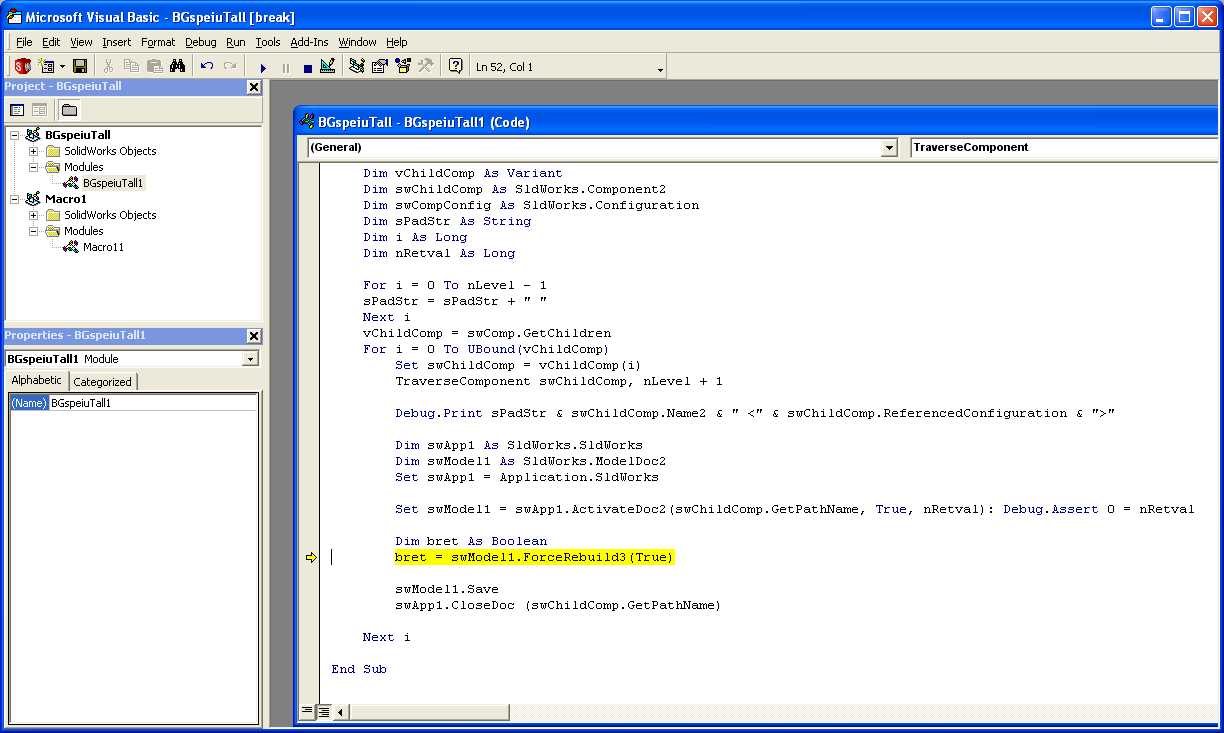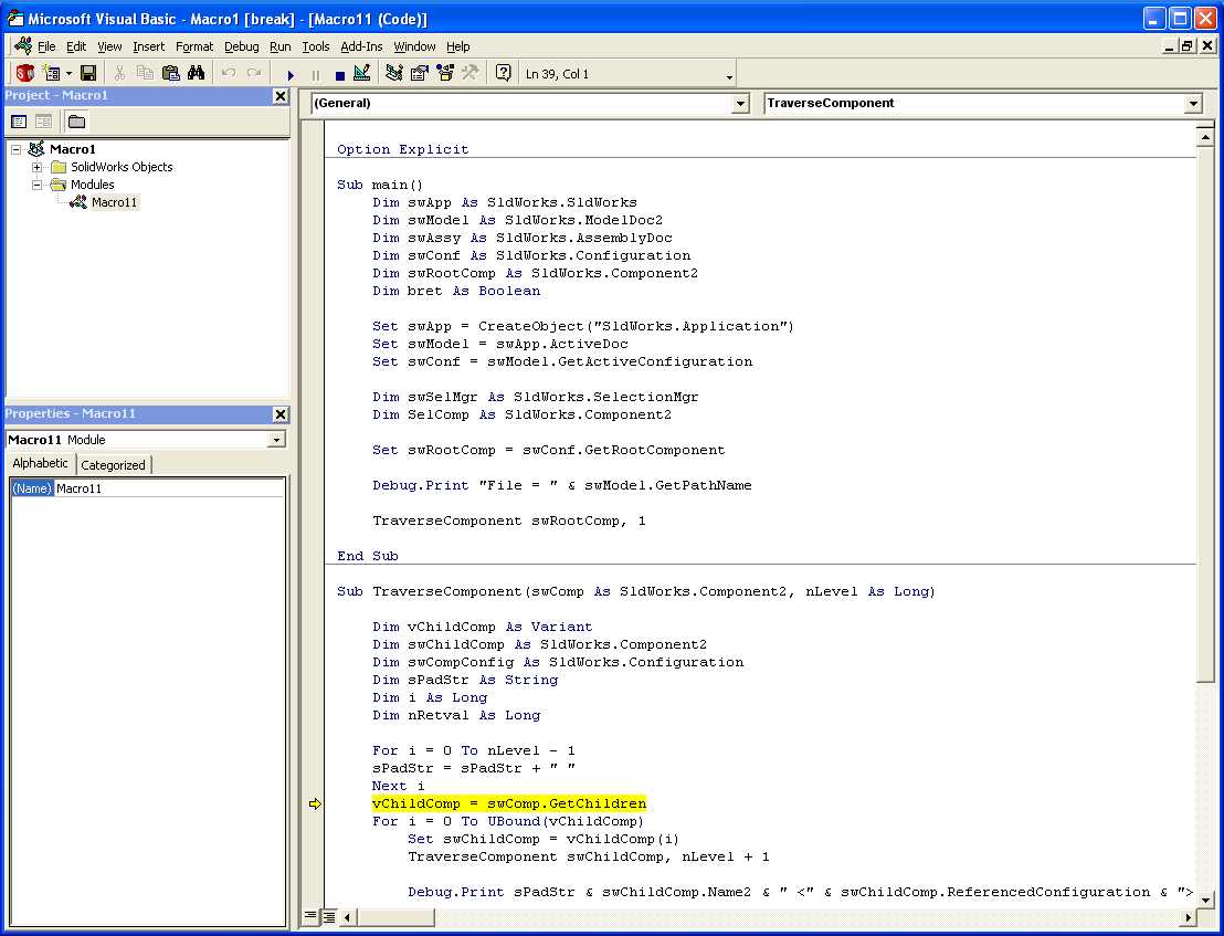 End Sub Sub TraverseComponent(swComp As SldWorks.Component2, nLevel As Long)
