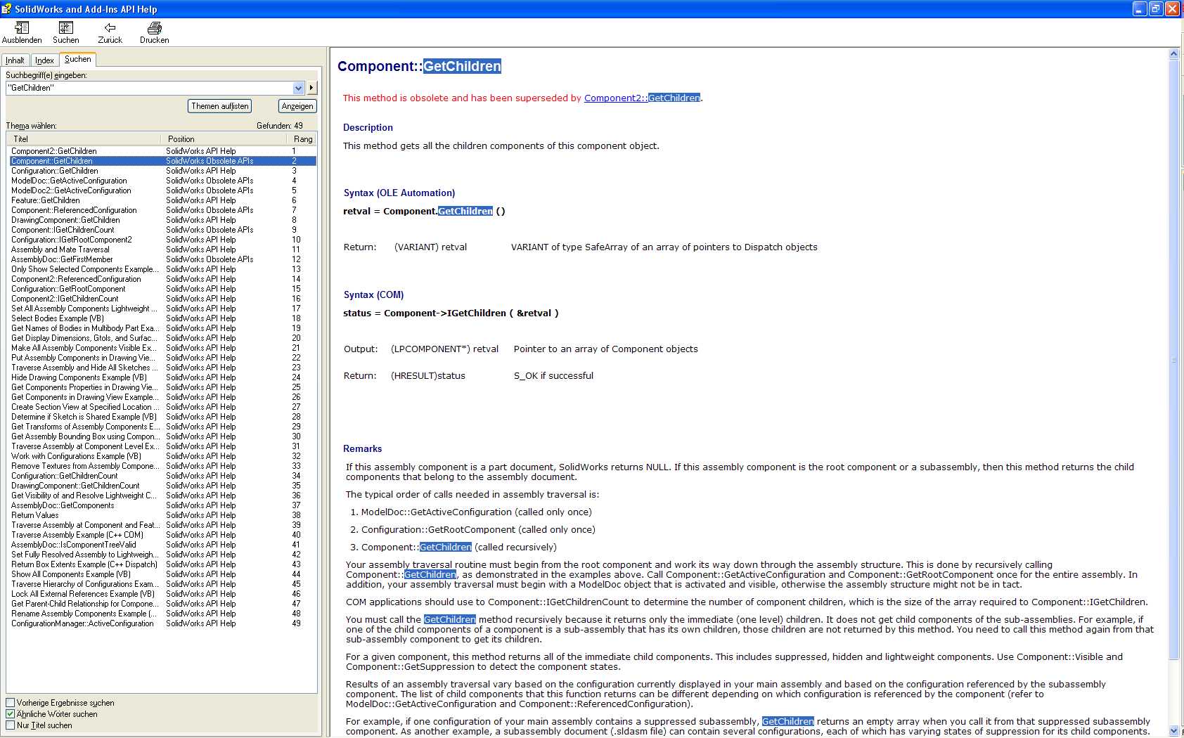 Öffne in SolidWorks die Hilfe -> API-Hilfe und suche nach "GetChildren". Was siehst Du?