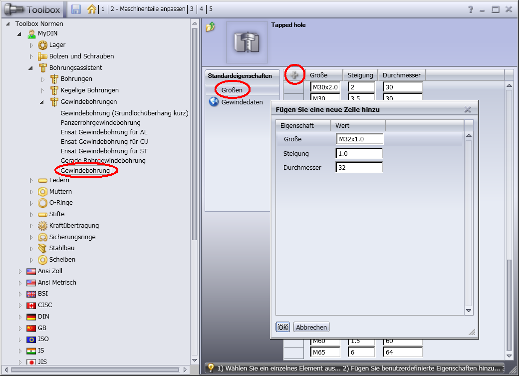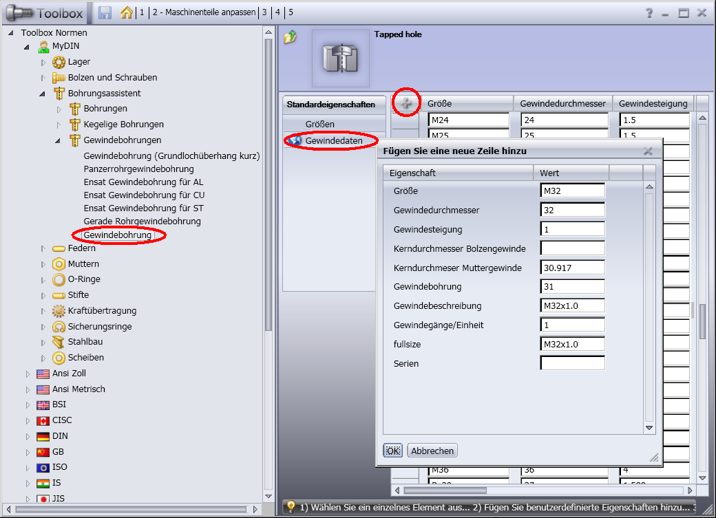 Hallo René, wenn Du mit der Toolbox arbeitest kannst Du ab SWX 2009 (frühere Versionen kenne ich nicht) wie folgt vorgehen: Zunächst musst Du eine Kopie der betreffenden Norm erstellen. Die standardmäßig von SolidWorks eingerichteten Normen können nicht bearbeitet werden. Hierzu über die Menüleiste "Toolbox" => "Konfigurieren..." die Anwendung "Toolbox Konfiguration" aufrufen. Unter "1 - Maschinenteile auswählen" kannst Du die entsprechende Norm auswählen und kopieren. Das kopieren erfolgt über das Symbol mit den zwei kleinen gelben Ordnern (s. "Toolbox kopieren.PNG"). Man wie lange habe ich gesucht bis ich diese Schaltfläche das erste Mal gefunden habe. Unter "2 - Maschinenteile anpassen" kannst Du neue Gewindebohrungen anlegen. Hierzu gehst Du in die abgeleitet Norm und erstellst unter "Bohrungsassistent" => "Gewindebohrungen" => "Gewindebohrung" jeweils eine Zeile in der Tabelle "Größe" und der Tabelle "Gewindedaten" (s. "Teil1 und Teil2 - Bohrungsassistent - Feingewinde M32x1.0 einfuegen.png"). Neue Zeilen fügst Du über das "+"-Zeichen ein. Falls Du das Dialogfenster nicht schließen kannst, weil ein Feld nicht ausgefüllt ist bzw. weil Du ein Feld nicht ausfüllen möchtest, schreibst Du einfach einen beliebigen Wert in das Feld. Diesen Wert löscht Du anschließend in der Tabelle wieder heraus. Mit freundlichen Grüßen Guido