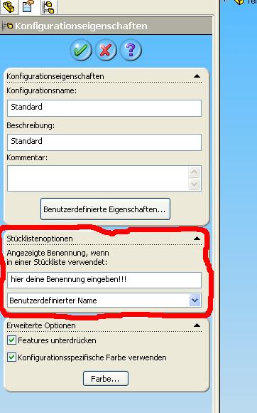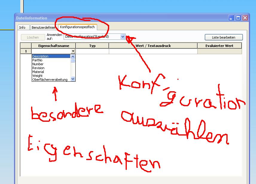 die Spalte Benennung1 deiner Stückliste muß natürlich von der Eigenschaft Description kommen, sonst geht das natürlich nicht. Dann ginge nur noch der Weg über die Konfigurations Spezifischen Eigenschaften des Teils(aber das geht auf jeden Fall) Anstatt Description kannst Du natrlich deine Standard Eigenschaften eintragen.