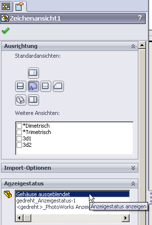 Klar, das machst du mit zwei verschiedenen Ansichtsstati und wählst den jeweils passenden für deine Zeichenansicht aus. Ciao, Stefan ------------------ Inoffizielle deutsche SolidWorks Hilfeseite http://solidworks.cad.de Stefans SolidWorks Blog Eine Antwort auf diesen Beitrag verfassen (mit Zitat/Zitat des Beitrags) IP |