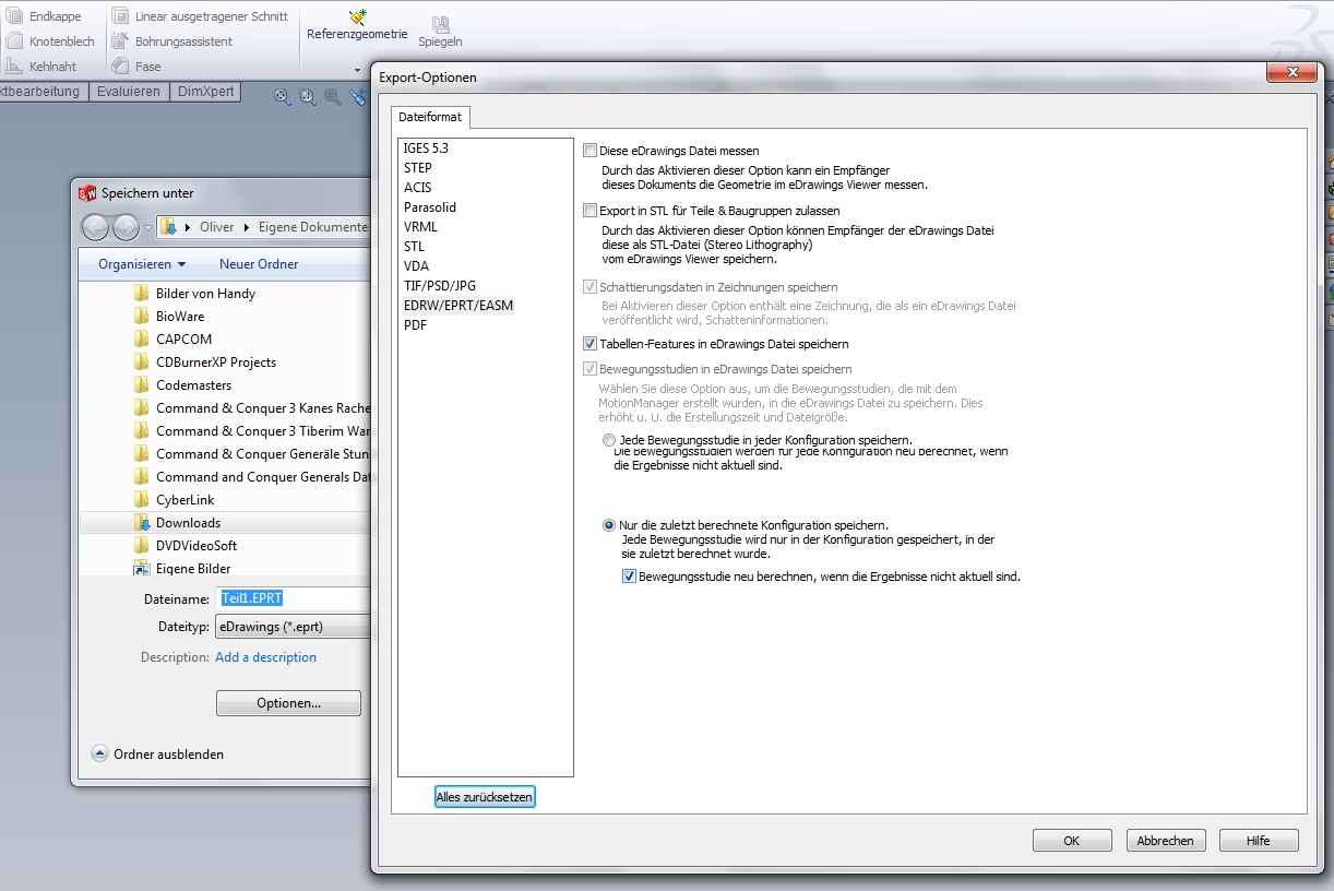 Hallo, kurze Frage: Wie kann ich denn genau eine Datei so nach eDrawings veröffentlichen das ich die in eDrawings Messen kann? IN der Hilfe steht: Wählen Sie in eDrawings im Dialogfeld Speichern unter die Option Messen ermöglichen. Klicken Sie in SolidWorks im Dialogfeld Speichern unter auf Optionen und wählen Sie Diese eDrawings Datei messen. Es gibt aber leider keine Option "Messen ermöglichen" . Also was genau muss ich machen damit das geht? Matthias Eine Antwort auf diesen Beitrag verfassen (mit Zitat/Zitat des Beitrags) IP |