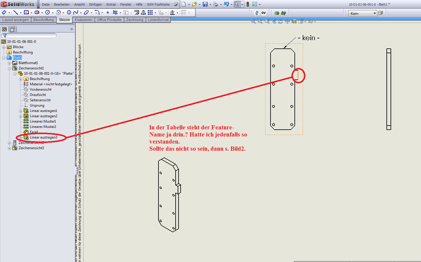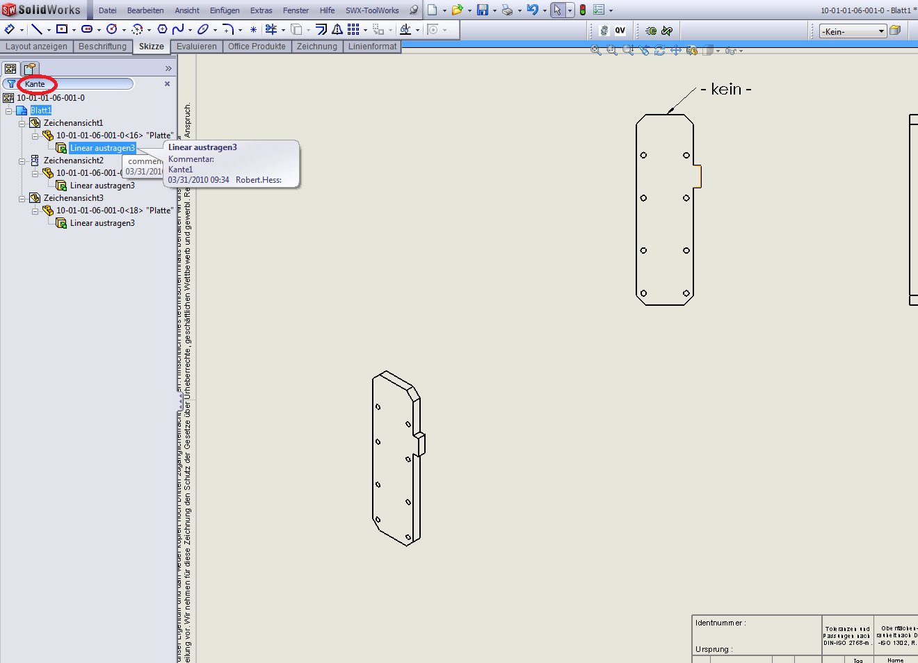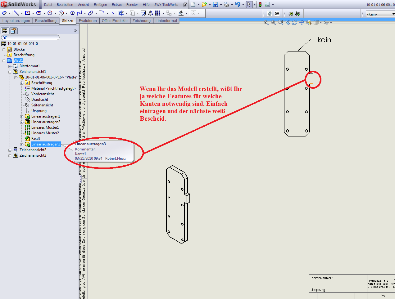 Also bedeutet Deine Erläuterung, daß Ihr nur die Kanten kenntlich machen wollt wo Pos.1 sich befindet. Da die Tabelle ja schon vorhanden ist und dort auch der Feature-Name enthalten ist kann man sich das doch in der Zeichnung anschauen welches Feature es ist. Falls dies nicht so ist, könnt Ihr doch bei der Modellerstellung die Info hinterlegen als Kommentar und schon weiß jeder darüber Bescheid. MFG Robert Hess. P.S: Ich hoffe ich habe jetzt alles kapiert. Man kann auch nach diesen Kommentaren über den Filter im Featurebaum suchen. s. Bild3 Darüber dies zu integrieren sollte/könnte man nachdenken für einige Dinge. Obwohl es noch eine weitere Möglichkeit über Etiketten gibt. ------------------ "Wir haben doch keine Zeit". Doch. Die muß man sich manchmal nehmen um Vorwärts zu kommen. Eine Antwort auf diesen Beitrag verfassen (mit Zitat/Zitat des Beitrags) IP |