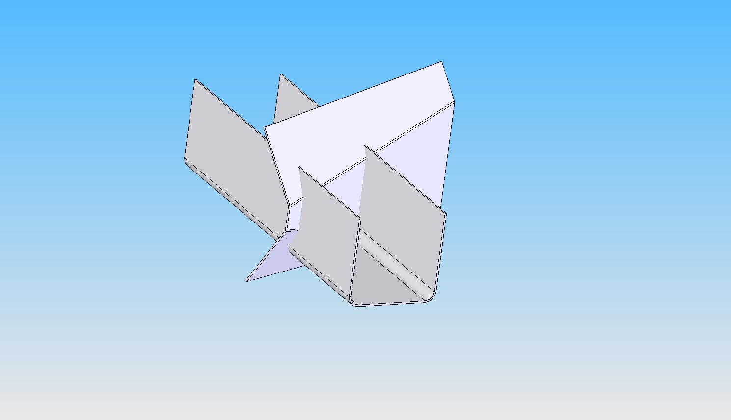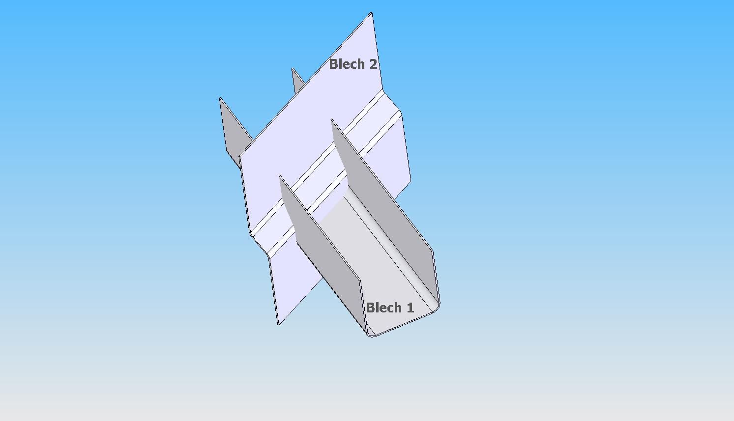 Einfach Blech 1 in der Bgr. bearbeiten, auf der Endfläche von Blech 2 eine Skizze öffnen, geeignete Kanten übernehmen --> Schnitt durch alles, fertig. Wichtig dabei: Der Haken bei "Normaler Schnitt" muß gesetzt sein, damit sich das Blechteil nachher korrekt abwickeln und schneiden läßt. HTH