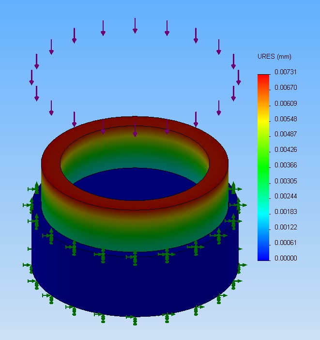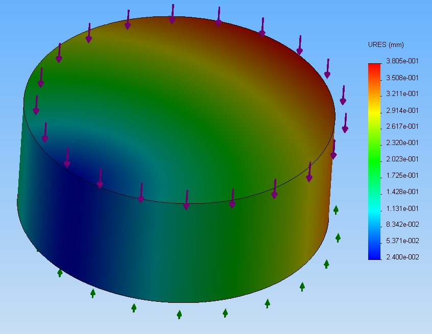 > Du die Berechnung in einer Brg. durchführst? Damit kannst du den Kraft-einleitenden Stempel mit abbilden... Die Kontaktbedingung "keine Penetration" würde dann noch zwischen den beiden Teilen definiert -> voilá. Ok, also: wie im Anhang zu sehen ist funktioniert das tatsächlich. Man muss zuerst ein Bauteim mit "unendlicher" Festigkeit defeinieren. Das werden dann die beiden Stempel. Dann baugruppe erstellen. Dann nimmt man die "keine Penetration" Option - und drückt das Ding zusammen. Funktioniert prima. Problem ist also erst mal gelöst aber wenn jemand noch eine einfachere Lösung kennt - dann immer her damit.