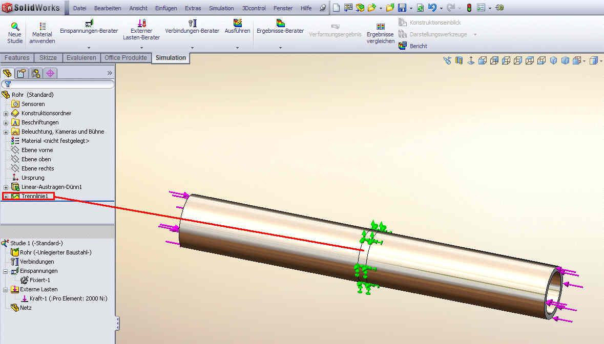 Hallo Dieter, anbei ein Bildchen wie es geht. Mit Trennlinie kanst Du die Rohrfläche (Zylinder)teilen. Auf die schmalen Flächen kannst Du die Fixierung, oder eine andere Lagerung aufsetzen. Auf die Stirnflächen die Krafteinleitung. Gruß Marco ------------------ Papa 2005 u 2007 Gib jedem Tag die Chance, der schönste Deines Lebens zu werden. Eine Antwort auf diesen Beitrag verfassen (mit Zitat/Zitat des Beitrags) IP |