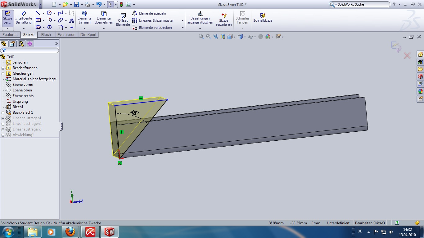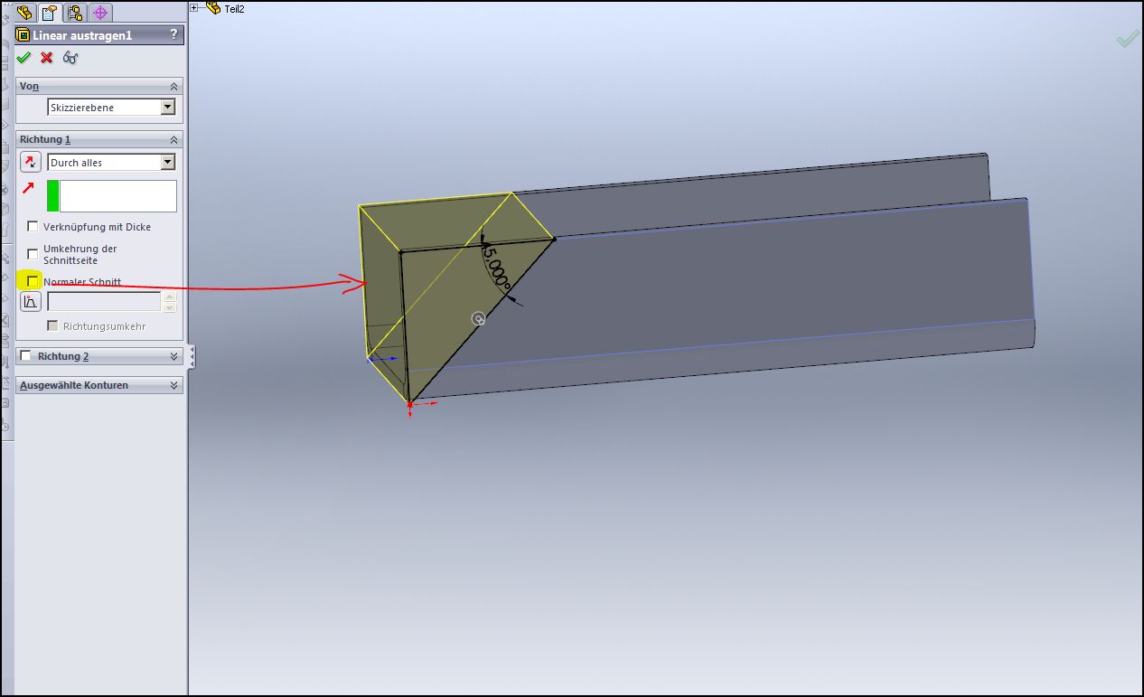 Hallo, wie in den Bildern gezeigt habe ich ein Blech, bei dem an einem Ende eine Schräge von 45° hin soll. Dachte, ich mach das mit einem linear ausgetragenen Schnitt. Aber nun hat Solid Works mir an der unteren Kante ein Stück gerade abgeschnitten. Das wollte ich so nicht haben, da zwei gleiche Teile jeweils an dieser Schräge zusammengeschweißt werden sollen. Was habe ich falsch gemacht ? (hab zur Zeit Solid Works 2009 Studentenversion) Viele Grüße, Silke Eine Antwort auf diesen Beitrag verfassen (mit Zitat/Zitat des Beitrags) IP |