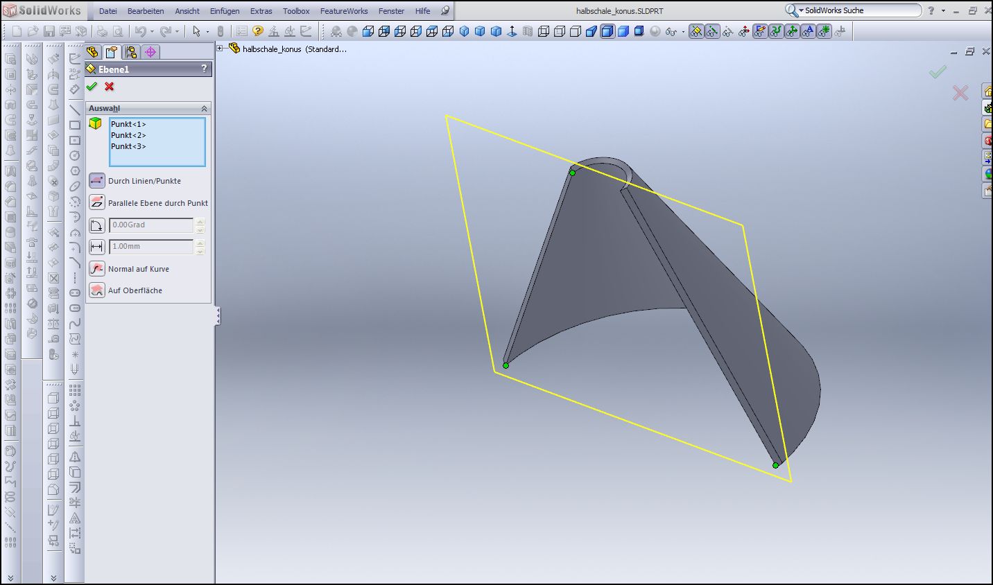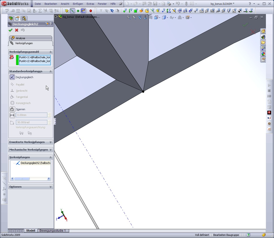 Hallo zusammen, ich habe folgendes Problem bzw besser gesagt: ich weiß nicht wo mein Denkfehler liegt. Ich habe zwei Halbschalen aus denen ich einen Konus zusammenschweißen möchte. Diese Halbschalen sind identisch und ich möchte sie erstmal ohne Spalt zusammensetzen. Allerdings kann ich noch so unterschiedlich verknüpfen - > es geht nicht glatt. Wo kann denn bei zwei "180-Grad-Halbschalen" ein Verknüpfungsproblem auftreten? Bin irgendwie ratlos. Anbei habe ich mal die Part-Datei; die BG und ein Bild mit meinem "Problem" angehängt. Vielleicht hat ja jemand einen freundlichen Rat für mich - würde mich sehr freuen Besten Dank, Christoph