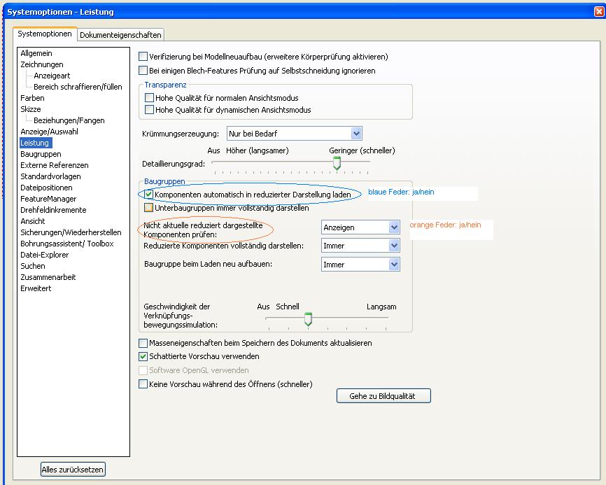 Hallo steftensteig, die Feder zeigt an, dass die Baugruppe in reduzierter Darstellung geladen wurde. Das passiert, wenn du eine "große" Baugruppe aufrufst, die mehr als xyz (Wert kann in den Optionen eingestellt werden) Komponenten beinhaltet. Du kannst in den Optionen einstellen, dass du immer die Komponenten in vollständiger Darstellung haben möchtest oder machst einen Rechtsklick auf den obersten Eintrag im Featuremanager und wählst den Punkt " Reduziert auf Vollständig einstellen" aus. ------------------ ========== Gruß Andreas ========== Eine Antwort auf diesen Beitrag verfassen (mit Zitat/Zitat des Beitrags) IP |