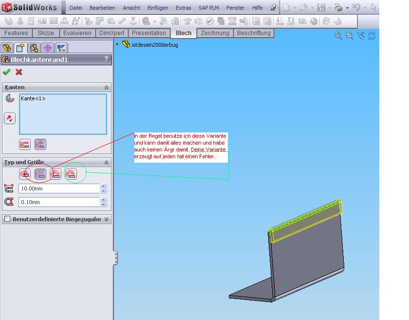 Lösung, stelle das Feature Blechkantenrand bei Typ und Größe auf das zweite Symbol (heißt öffnen) dort kannst Du die Lineare Austragung gleich mitmachen. Du must aber definitiv länger als nur die Biegung(radius) sein, so daß noch ein stückchen gerade folgt, dann könntest Du auch die Lineare Austragung mitmachen.