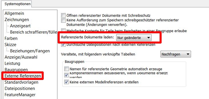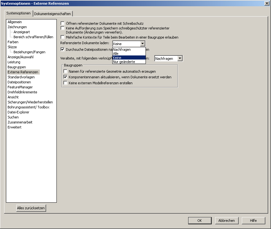 Der Haken ist aber relativ gefährlich. Änderungen an dem referenzierten Teil bekommt das Teil nur mit, wenn das refernzierte Teil geöffnet/geladen wird. Öffnet man das Teil und an dem referenzierten Teil hat eine Änderung stattgefunden, bekommt man immer noch den ALTEN Stand. Erst wenn das referenzierte Teil geöffnet wird und neu lädt, werden die Änderungen übernommen. Zumindest geänderte Teile sollten mit geöffnet werden. 3. Möglichkeit im Auswahlfenster. Eine Antwort auf diesen Beitrag verfassen (mit Zitat/Zitat des Beitrags) IP |