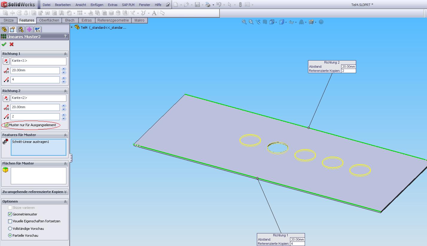 Zitat: Original erstellt von Robert Hess: Hallo,nur um sicher zugehen. Hier ein Screenshot der Einstellung für das Mustern im Einzelteil. Der Haken bewirkt dann daß es nicht zu einer Doppelbelegung der mittleren Bohrung. Wenn Du dann in der Baugruppe "Featuregesteuert" Musters gibt es kein Problem. So denke ich meinte es auch goofy_ac. MFG Robert Hess.