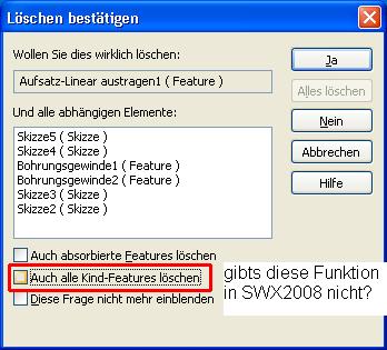 Hallo, mit löschen bin ich meist Vorsichtig, aber bevor ich Features aus der mitte des Featurebaumes lösch gehe ich her und unterdrück ich zuerst das Feature das ich löschen möchte. Dann sehe ich welche Features im Baum mit unterdrückt werden. So kann ich dann einfacher die Beziehungen und Verknüpfungen herausfinden die noch überarbeitet werden müssen. Sollten es falsche Beziehungen geben, findet man sie recht schnell. ------------------ Gruss Frank O.