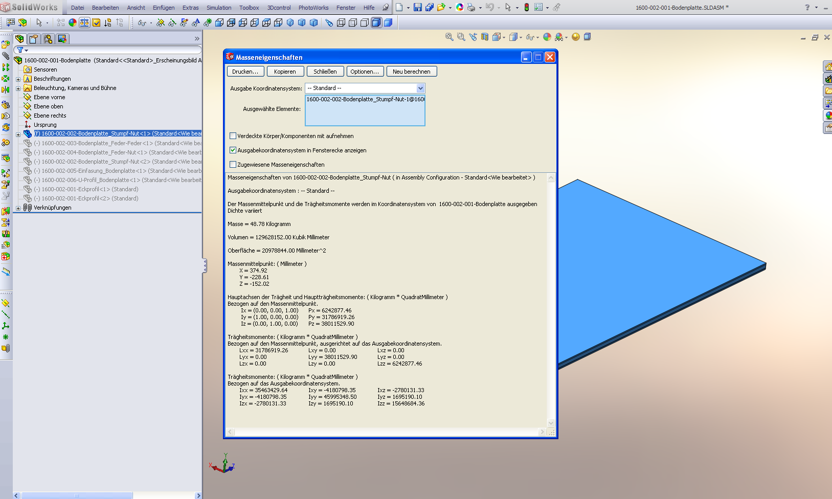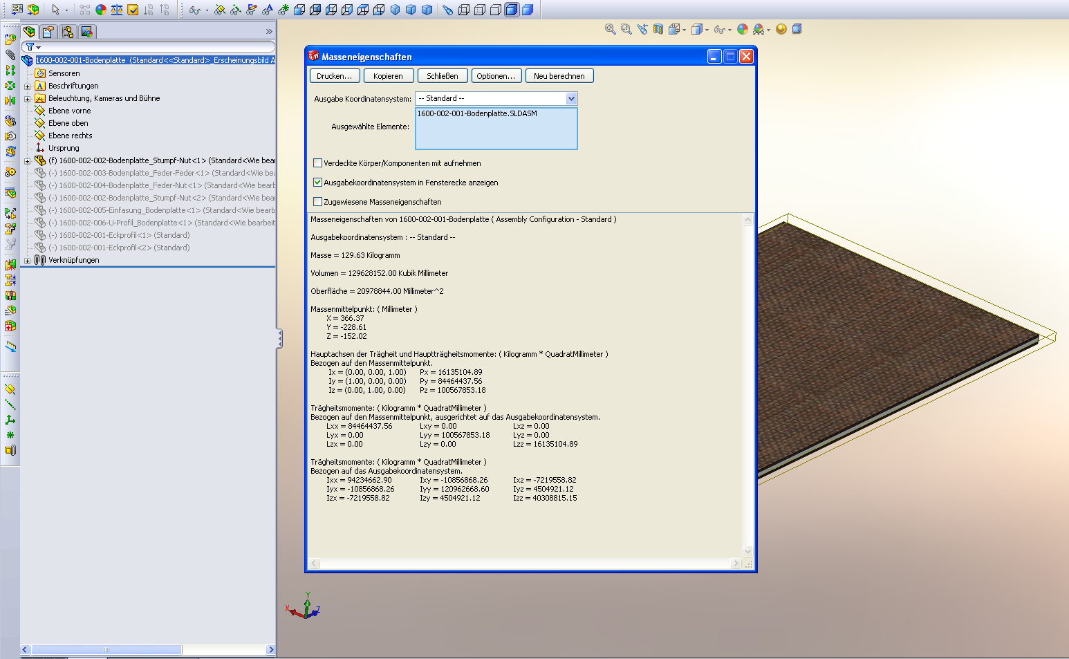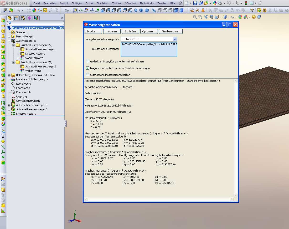 Sorry, einen Schuss zurück. Mit dem Musterfeature hat es wohl doch nichts zu tun. Wohl eher damit das der Körper (Schweißkonstruktion) aus verschiedenen Materialien besteht. Vielleicht einmal mit Bildern erklärt: Im Bild 1 habe ich alle, bis auf den ersten, Körper unterdrückt. Gewicht der Baugruppe gemessen, ergibt ca. 130kg (falsch!). Im Bild 2 habe ich das Gewicht des Körpers in der Baugruppe gemessen, ca. 50kg (richtig). Bild 3 zeigt die Gewichtmessung im Körper, ergibt ebenfalls 50kg. Anscheinend gibt in der Baugruppe ein Problem mit den verschiedenen Materialien, gibt SWX nun vielleicht dem Körper(welcher aus Teilkörpern besteht) ein Material?! Ich hoffe das Problem lässt sich nun ein wenig besser verstehen. Danke! Eine Antwort auf diesen Beitrag verfassen (mit Zitat/Zitat des Beitrags) IP |