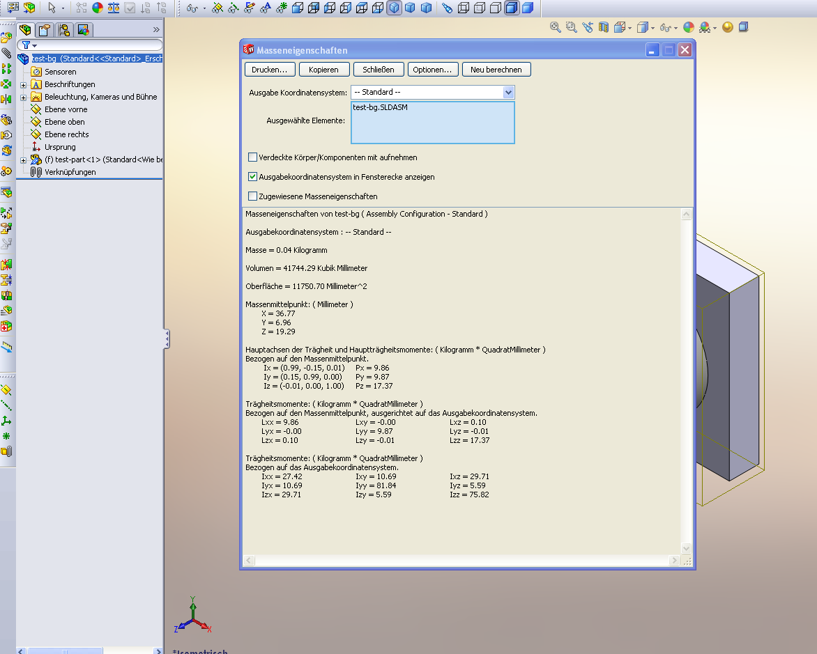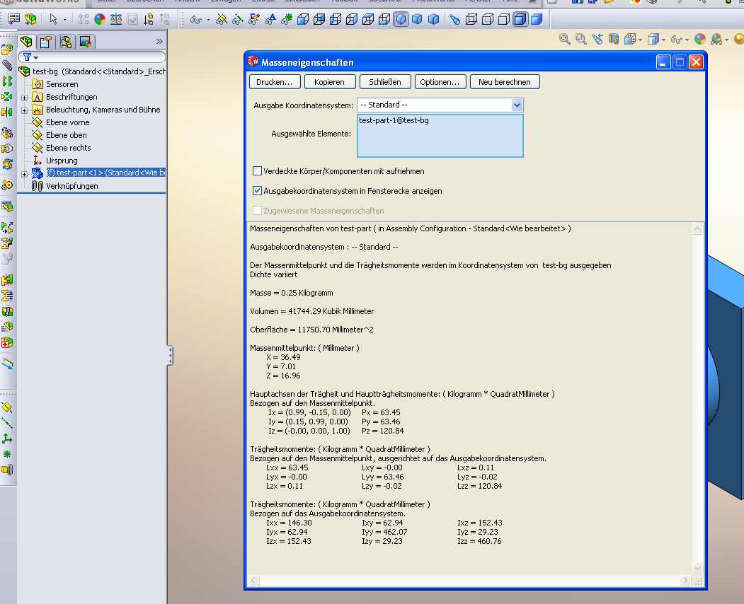 Hallo zusammen, ja, kann ich bestätigen mit Sw2010 SP3.0 geht es auch schon korrekt. Wenn ich die Baugruppe öffne, Komponente reduziert geladen, bekomme ich bei den Masseeigenschaften die (gespeicherte) Masse 0,04kg, sobald ich das Teil vollständig darstelle auch in der Baugruppe direkt den korrekter Wert 0,25 Könnte mit diesen SPR zusammen hängen, der in SP3.0 gefixt wurde 534586 Mass properties of this multi body part are incorrect at assembly level - materials applied at body level Ciao, Stefan