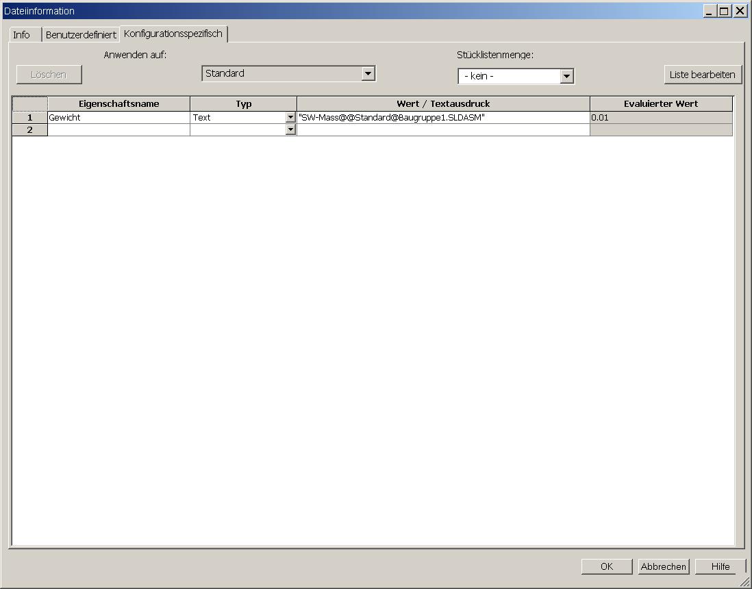 Ich habe dein Teil geöffnet und es wird bei mir im Teil und in der BG jedesmal 0,25kg angezeigt. Anscheinend handelt es sich um einen Bug mit SW2010 SP0. Vielleicht ist hier im Forum noch jemand der die gleiche Version hat und dies versuchen kann. ------------------ Gruß bbonisch Wer nicht träumt, der ist tot.  Eine Antwort auf diesen Beitrag verfassen (mit Zitat/Zitat des Beitrags) IP |