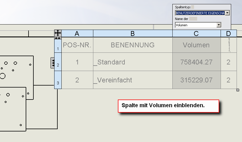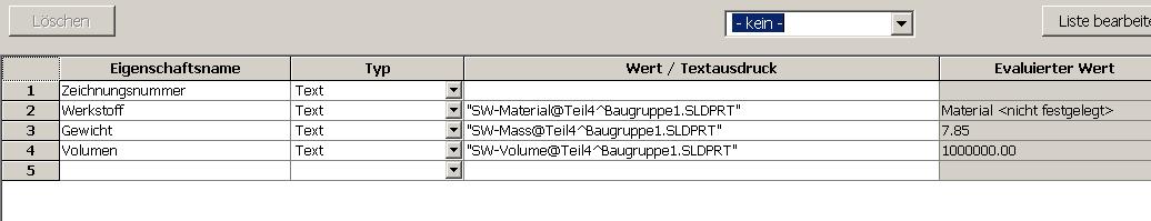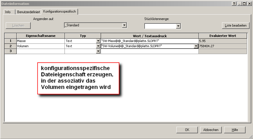 Hallo, ich muss noch mal weiter ausholen. Die oben erwähnten Lösungen konnte ich nachvollziehen und die funktionieren auch. Das Problem: Ich bekomme eine Baugruppe( Fremddaten) mit 100 Komponenten. Es wird von jeder Komponente das Volumen benötigt. Mit der o.a. Lösung müßte ich jede Komponente " anfassen" und die Eigenschaften ändern, das wollte ich eigentlich nicht. Da ich sehr faul bin, wollte ich eine Lösung "auf Knopfdruck". - die Zeit für eine Tabelle ist aber schon da :-) viele Grüsse, Heribert