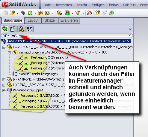 Ich versuch die Aufgabe mal mit meinen Worten zusammen beschreiben: du möchtest Verknüpfungen gerne schnell und einfach identifizieren, und am liebsten wäre es dir, wenn bestimmte Verknüpfungen, die deinen Kriterien entsprechen, oben im Verknüpfungsbaum auftauchen. Ich hab kein 2006 mehr, aber in 2010 ist das verhältnismäßig einfach, wenn man sich selbst ein paar Spielregeln gibt und die einhält. Zum einfachen Identifizieren von bestimmten Verknüpfungen würde ich einfach empfehlen die entsprechend zu benennen - denkt euch einen markanten Namen aus und benennt die für euch wichtigen Verknüpfungen entsprechend. Auf diese Weise könnt ihr z.B. auch ganz einfach und schnell über den Filter im Featuremanager die entsprechend für euch wichtigen Verknüpfungen wiederfinden. Wenn neben dem Identifizieren auch noch die Position im Featurebaum für irgendwas wichtig ist könnt ihr die Reihenfolge im Featuremanager durch entsprechendes Drag-Drop der Verknüpfungen in die Reihenfolge bringen, die ihr möchtet, siehe Video. Zitat: Original erstellt von hanse1: Gibt es dafür irgendwo ein Makro? Ein Makro also, das die Basisverknüpfung (z.B einer Platte in X, Y und Z) für das JEWEILIGE TEIL IMMER NACH GANZ OBEN SCHIEBT, [...]