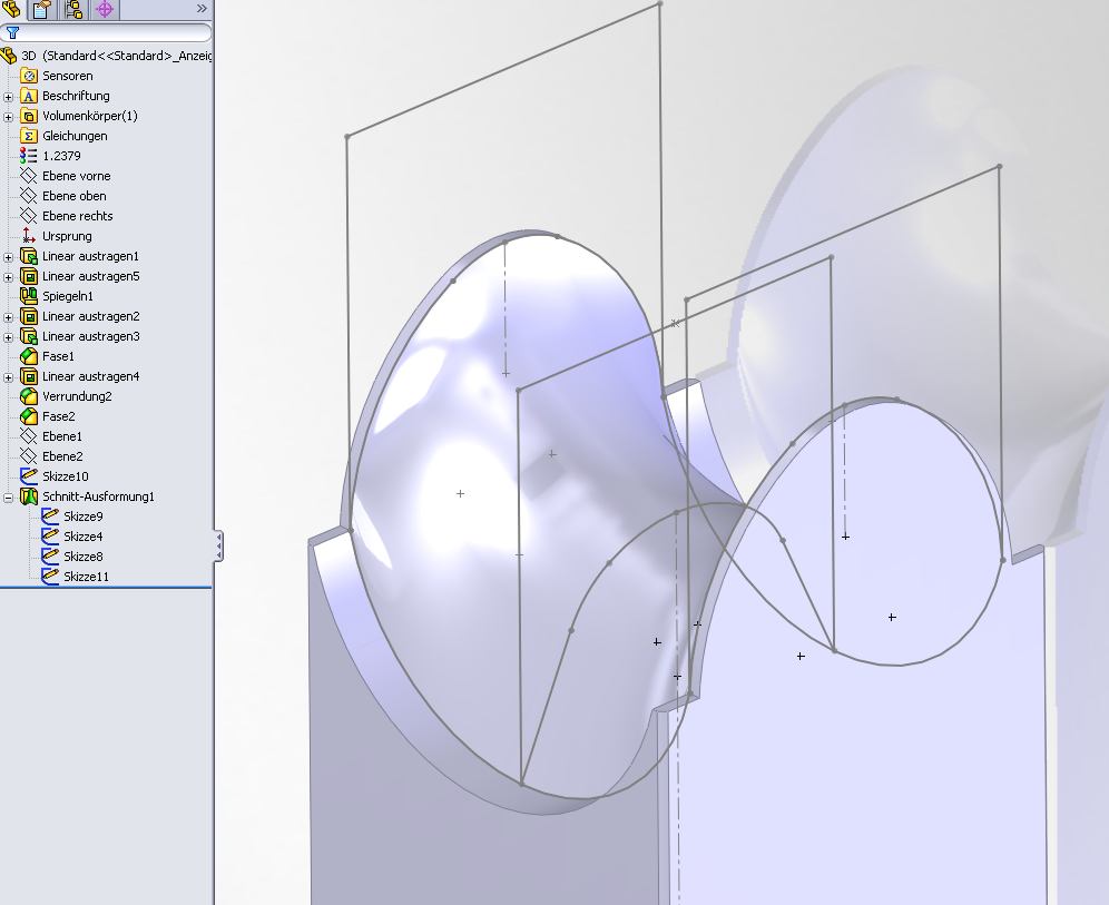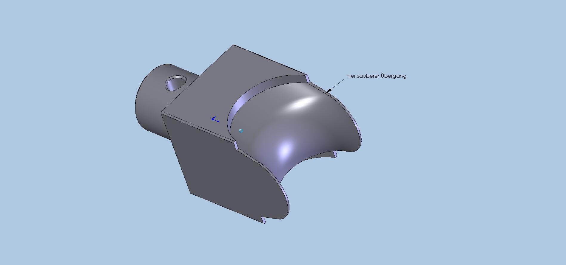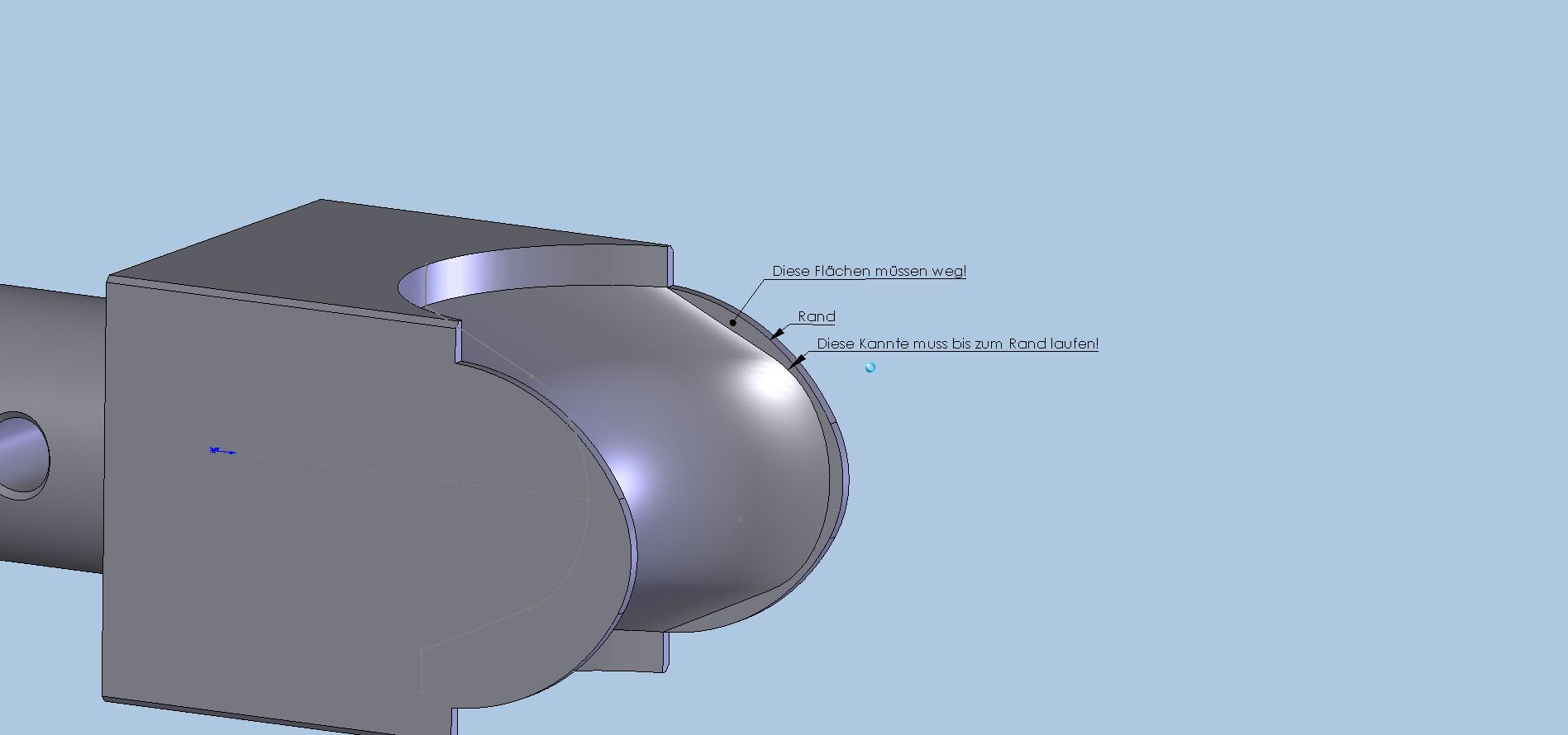 Hallo Klaus, ich habe leider nur SWX  2010 auf der Platte, darum hab ich dir das Solid als gezipptes Parasolid angehängt. (Auspacken und in SWX  öffnen) Ich habe zwei neue Ebenen erstellt (mit dem Abstand des Randes)und darauf Skizzen mit der Schnittkontur, die ich nach oben geschlossen habe. Die Anzahl der Skizzenelemente (kreise, Linien) muss gleich hoch sein, wie in deiner Skizze in der Mitte. Deshalb hab ich in den Konturskizzen den obersten Kreisbogen in zwei Teile zerlegt. Aus den beiden Kontourskizzen und deiner Pfadskizze hab ich eine ausgeformte Austragung erstellt und ihr den Halbbogen als Pfad mitgegeben. Zu deiner Lösung hab ich letztlich nur die Ausformungsrichtung um 90° gedreht. Das war es. (Hoffe ich) Ich glaube, dass du das mit deinem SWX 08 ebenfalls so modellieren kannst. Grüße Günter Eine Antwort auf diesen Beitrag verfassen (mit Zitat/Zitat des Beitrags) IP |