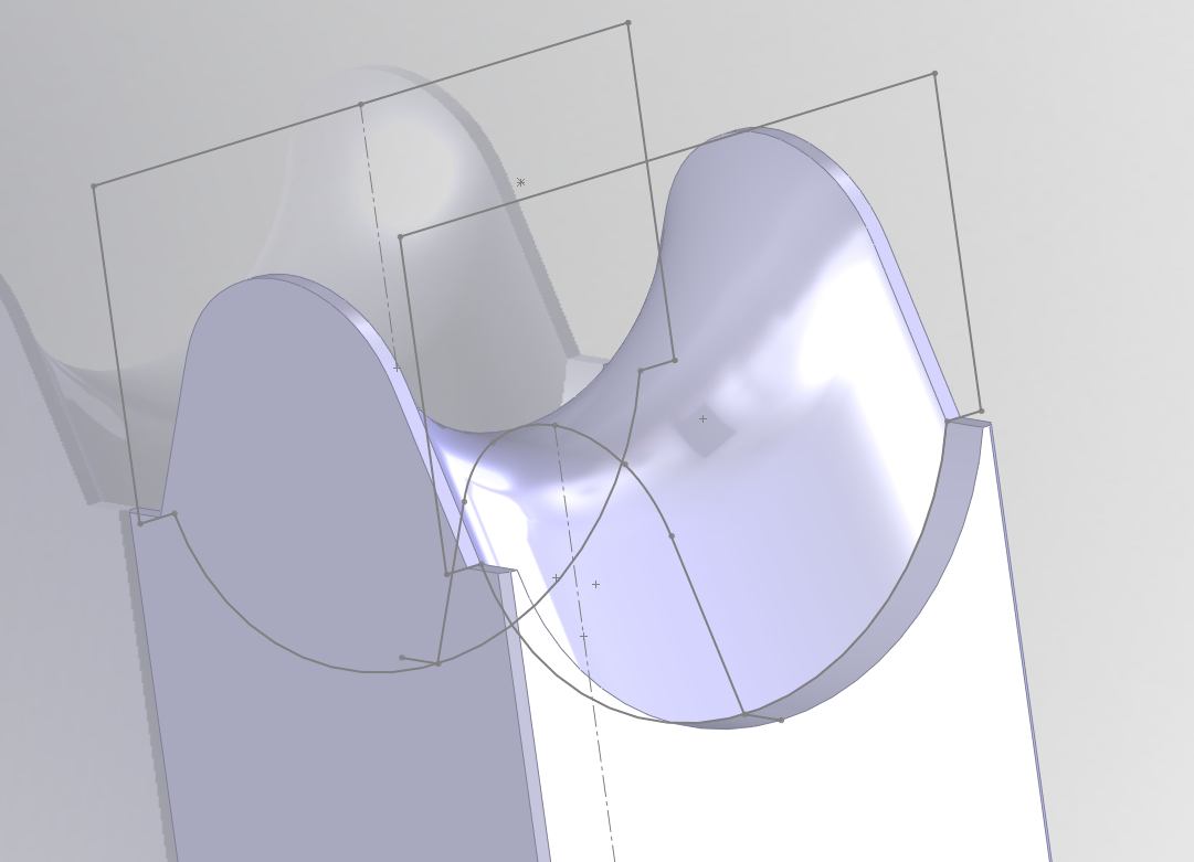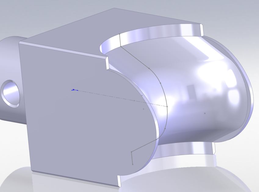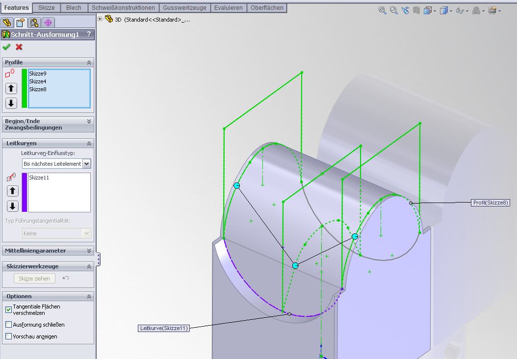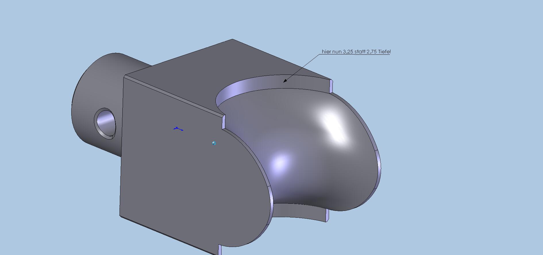 Hallo Klaus, ich habe leider nur SWX  2010 auf der Platte, darum hab ich dir das Solid als gezipptes Parasolid angehängt. (Auspacken und in SWX  öffnen) Ich habe zwei neue Ebenen erstellt (mit dem Abstand des Randes)und darauf Skizzen mit der Schnittkontur, die ich nach oben geschlossen habe. Die Anzahl der Skizzenelemente (kreise, Linien) muss gleich hoch sein, wie in deiner Skizze in der Mitte. Deshalb hab ich in den Konturskizzen den obersten Kreisbogen in zwei Teile zerlegt. Aus den beiden Kontourskizzen und deiner Pfadskizze hab ich eine ausgeformte Austragung erstellt und ihr den Halbbogen als Pfad mitgegeben. Zu deiner Lösung hab ich letztlich nur die Ausformungsrichtung um 90° gedreht. Das war es. (Hoffe ich) Ich glaube, dass du das mit deinem SWX 08 ebenfalls so modellieren kannst. Grüße Günter Eine Antwort auf diesen Beitrag verfassen (mit Zitat/Zitat des Beitrags) IP |