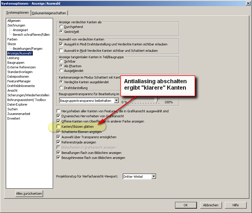 Ah, das macht die Sache dir zu helfen einfacher: es gibt auch in SolidWorks noch eine Möglichkeit, das Antialiasing einzuschalten, das eben die Kantenglättung dann darstellt - was auch in meinem Empfindeneher zu einer "schwammigen" Darstellung führt; ich mag es auch nicht. Also schau mal unter Extras/Anzeige recht weit unten, der Haken bei Kanten/Skizzen glätten rausmachen sollte klarere Kanten geben. Ciao, Stefan ------------------ Inoffizielle deutsche SolidWorks Hilfeseite http://solidworks.cad.de Stefans SolidWorks Blog Eine Antwort auf diesen Beitrag verfassen (mit Zitat/Zitat des Beitrags) IP |