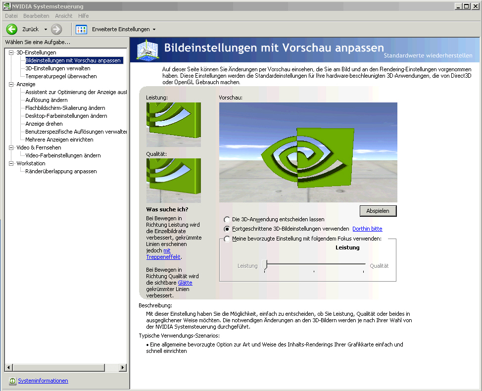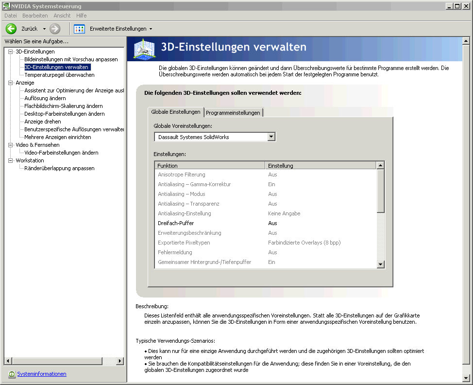 Hallo Tobias Gehe mal in die Nvidia Systemsteuerung und schau ob da der Schieberegler auf Leistung (dann mehr Treppeneffekt) oder Qualität (glattere Kanten) steht. Bei "3D-Eintstellungen verwalten" kannst du die für SWX optimierte Einstellung auswählen. Gruß Daniel Eine Antwort auf diesen Beitrag verfassen (mit Zitat/Zitat des Beitrags) IP |