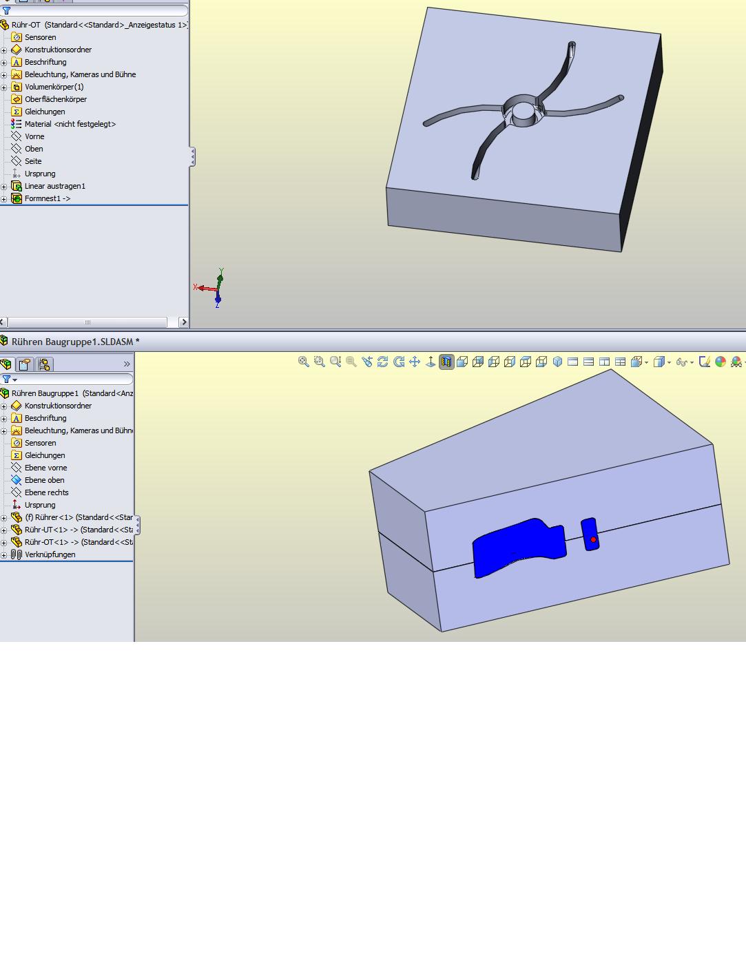 Gut, ich sehe ein, dass mein Hilferuf doch etwas sehr verzweifelt klingt und nicht richtig beschreibend ;-) Also: Es sind Rührer vorhanden aus ABS, die Blätter dieser Rührer sollen mit Wachs (gut geraten!) beschichtet werden, deswegen soll ich eine Gussform erstellen, die dann auch aus ABS hergestellt wird und mit deren Hilfe die Beschichtung gleichmäßig über die Fläche verteilt wird. Soweit so gut. Ich habe eigentlich keine Erfahrung mit SolidWorks, ich kann einfache Geometrien Skizzieren und auch einfache Baugruppen zusammenstellen (komme aus der Biotechnologie...). Jetzt haben sich mein Chef und mein Prof gedacht, die lassen wir mal eine Belegarbeit zu Gussformen machen, das bekommt sie hin, da gibts Tutorials.... Nunja, und dann habe ich mir das Tutorial/Lehrbuch angeguckt und versucht mit diesem schei* Telefonhörer was zu erstellen. Bin bei der Erstellung der Trennoberflächen hängen geblieben. Ehrlich gesagt weiß ich weder was ich da tue noch wie ich es eigentlich tun sollte. Und ja, mein Termin ist schon sehr unliebsam nah, weil ich erstmal alleine versuchen wollte und ich mich von einer Software nicht in die Knie zwingen lasse....aber nun muss ich kapitulieren. Eine Antwort auf diesen Beitrag verfassen (mit Zitat/Zitat des Beitrags) IP |