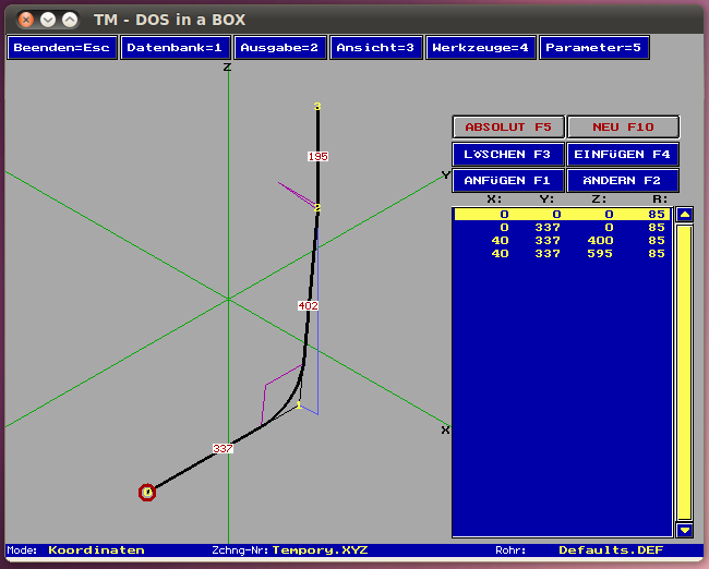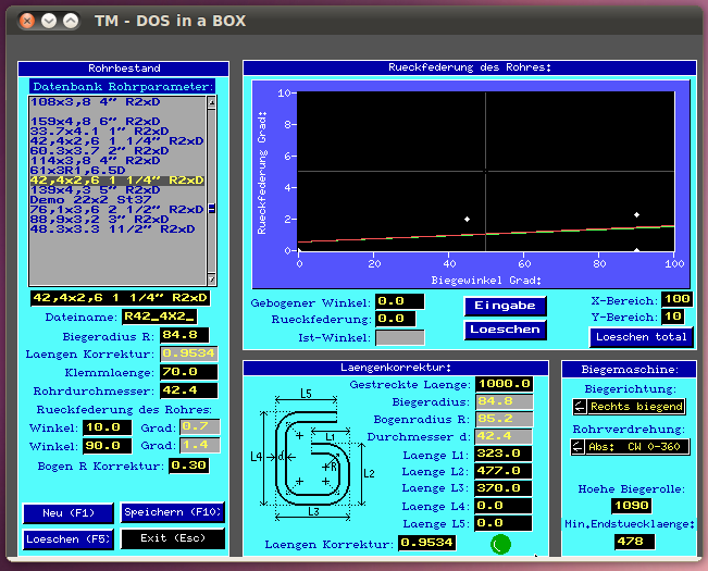 Wir haben Biegemaschine und Software von Tracto-Technik. Ich denke, die Biegeparameter und Längenermittlung sind immer von der jeweiligen Maschine des Herstellers abhängig. Unsere Software ist inzwischen so alt, dass diese nur noch mit DOSEmu unter Linux läuft -- das aber besser als je zuvor. Ich habe zur Verdeutlichung ein paar Bildschirmfotos angehängt. Gruß, Klaus. Eine Antwort auf diesen Beitrag verfassen (mit Zitat/Zitat des Beitrags) IP |
