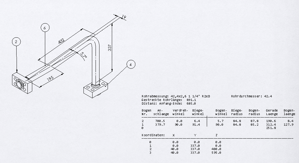 Man könnte das Routing-Paket hierfür missbrauchen, in dem man den Draht wie eine "elektrische Leitung" verlegt. Anschließend kann eine flache Ansicht erzeugt werden. Hierbei werden allerdings keine Biegeparameter berücksichtigt und man bekommt nur die theoretische Länge. Rohre werden in der Regel auf einer Rohrbiegemaschiene gebogen und hierfür gibt es in der Regel separate Programme, die entsprechende Parameter für das jeweilige Rohr hinterlegt haben. Ich mache es immer so, dass ich mir vom Rohr die Leitungsdaten exportiere und anschließend in unser Rohrbiegeprogramm importiere. Anschließend bekomme ich die passenden Biegeparameter für unsere Biegemaschine und die benötigte Länge. Die Länge ist kürzer als die theretische Länge und die Differenz hängt von Biegewinkel und Anzahl der Biegungen ab. Gruß, Klaus. Eine Antwort auf diesen Beitrag verfassen (mit Zitat/Zitat des Beitrags) IP |