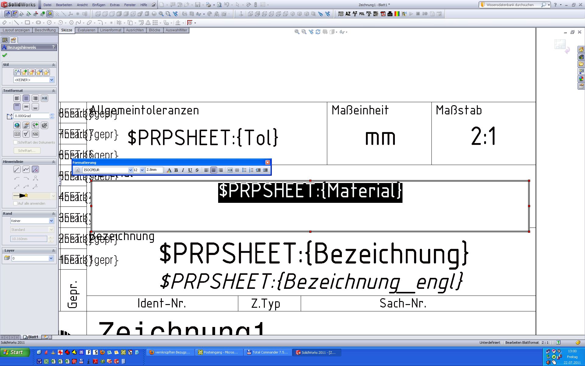 schon wieder stolpere ich.... Es gibt einen verknüpften Bezugshinweis Eigenschaften-Registerkarte <-> Zeichnungskopf. Die einzutragende Bezeichnung ist zu lang für das Feld im Zeichnungs-Schriftfeld. Zeilenumbruch-funktion, gibts sowas? Eine Antwort auf diesen Beitrag verfassen (mit Zitat/Zitat des Beitrags) IP |