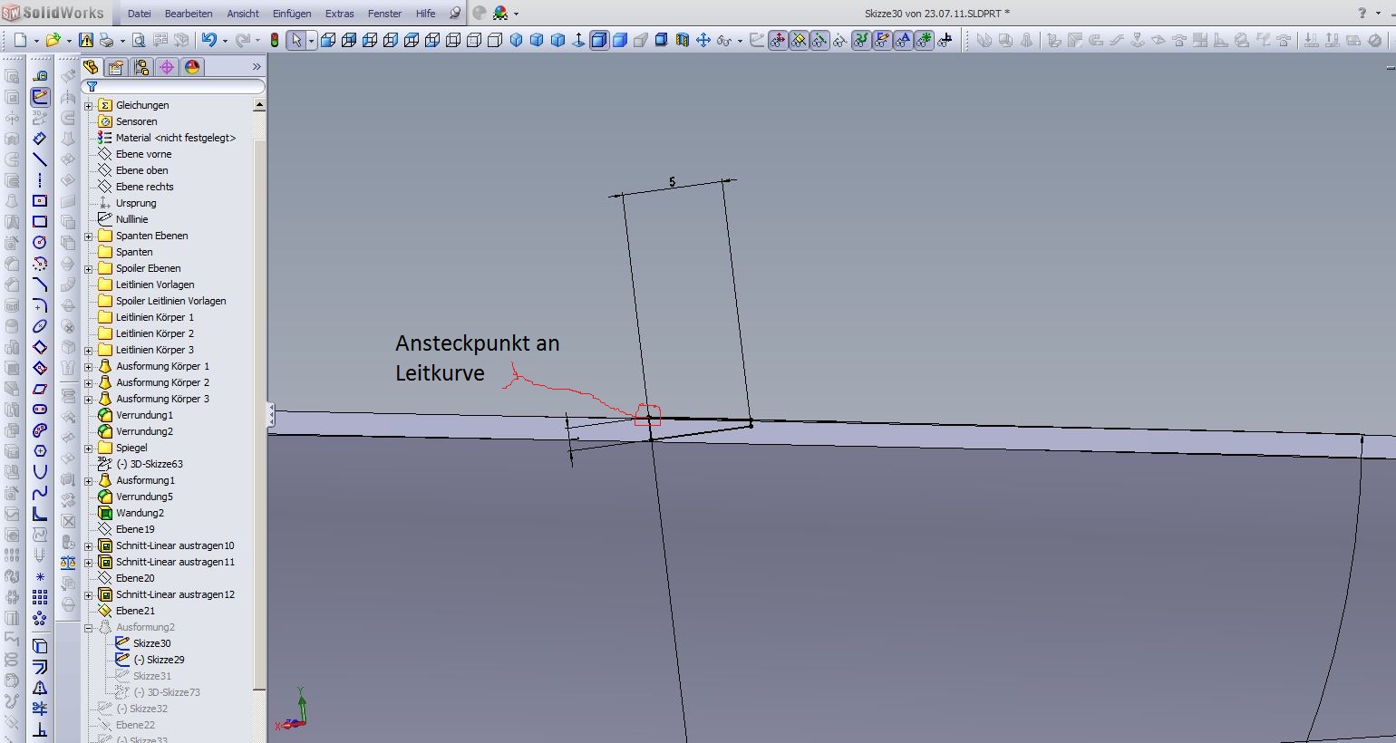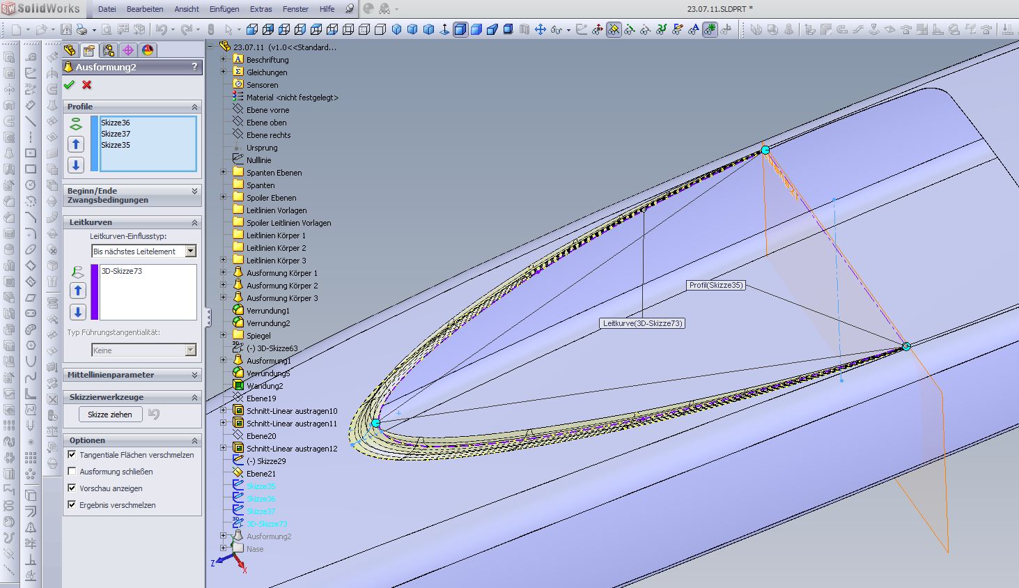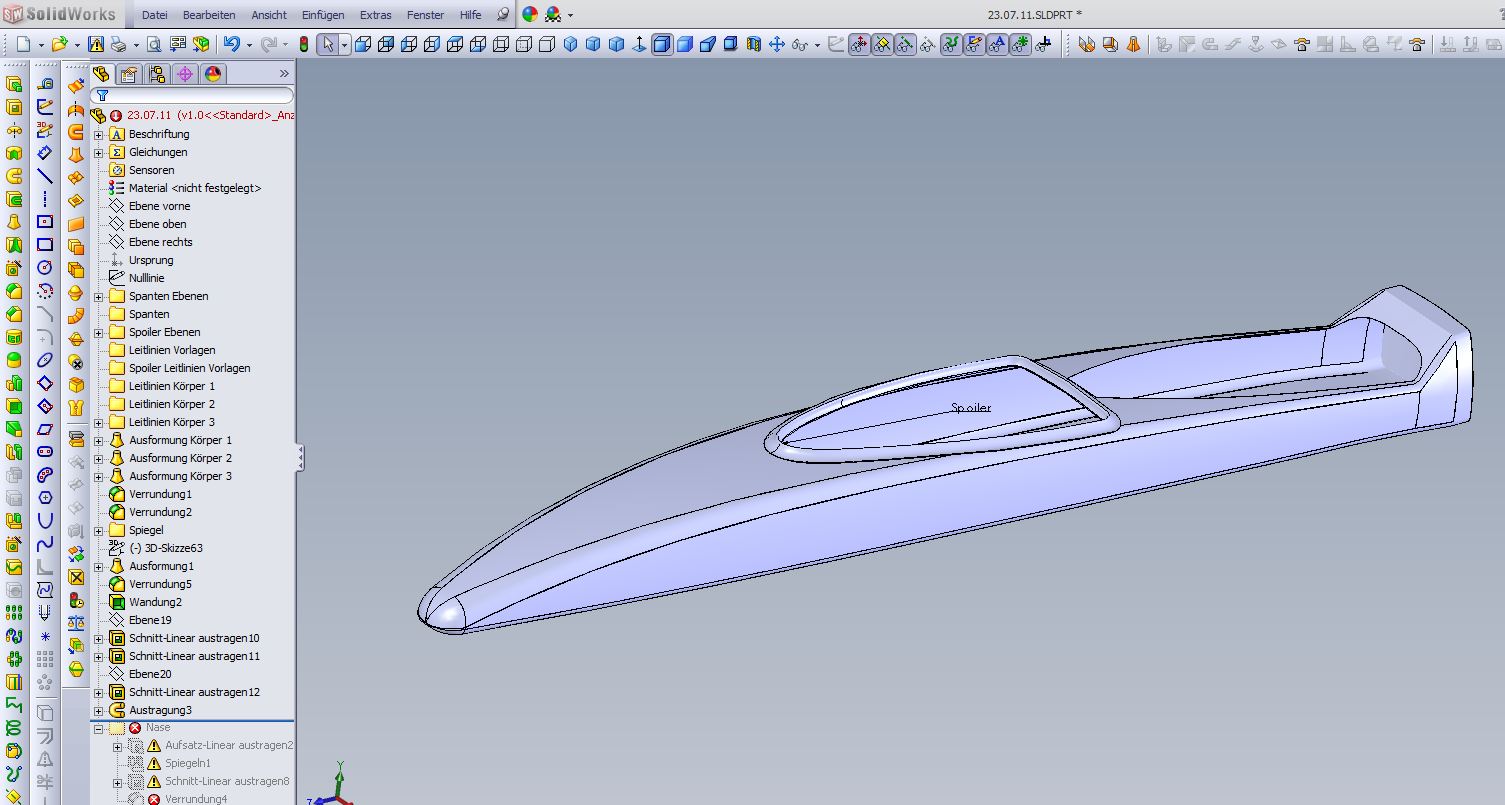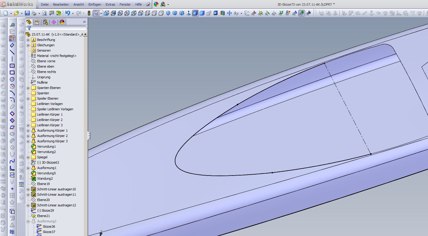 Hallo, Ansteckpunkt des Profil passt nicht, Leitkurve passt nicht (die muss so aussehen wie in meinem Bild einen Beitrag weiter oben) Ausformung braucht 3 Profile ! 1.Profil seitlich rechts 2.Spoilerprofil mittig 3.Profil seitlich links Leitkurve ist eine 3D Skizze wie in meinem Bild F2_022542_5.JPG zu sehen. Grüße Andreas