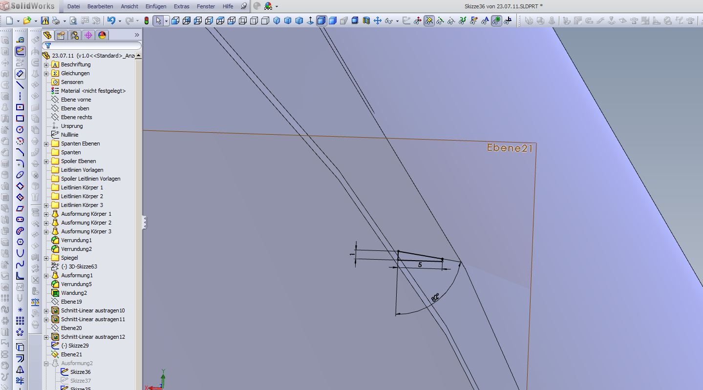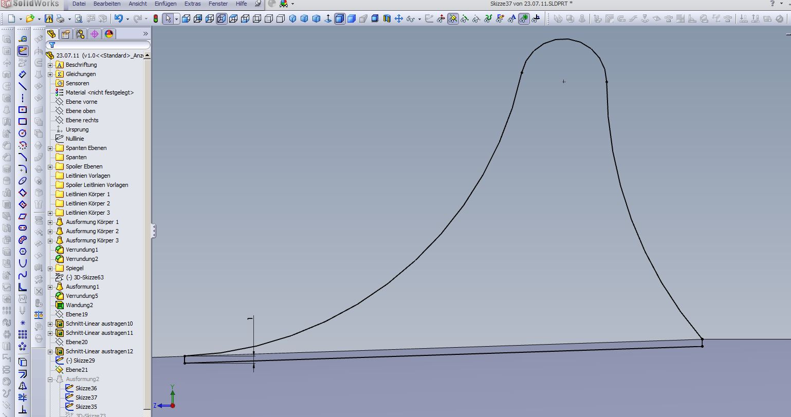 Hallo Ryan, erstelle eine Parallele Ebene mit ca. 3000mm zu Ebene Vorne. Darauf eine Skizze ungefähr wie Bild 1 Dann neue Skizze auf der anderen Seite (Skizze spiegeln) Übernimm in einer 3D Skizze die Innenkontur als Leitkurve Schließe die Kontur Deiner Spoilerskizze Bild 2 Dann eine Ausformung mit Leitkurve Bild 3 Hätte gerne die Datei angehangen aber 2011 wird Dir wohl nicht weiterhelfen.