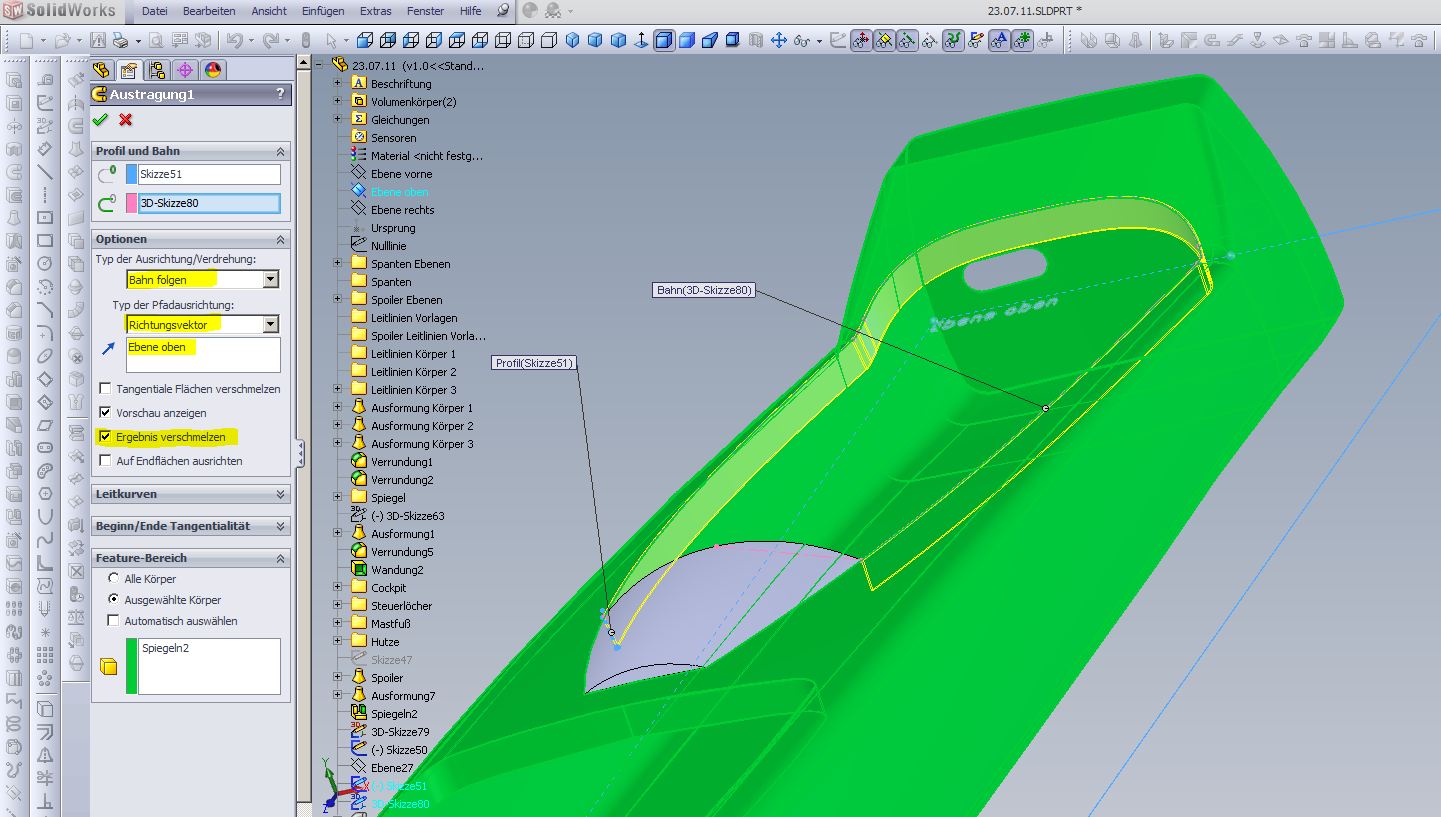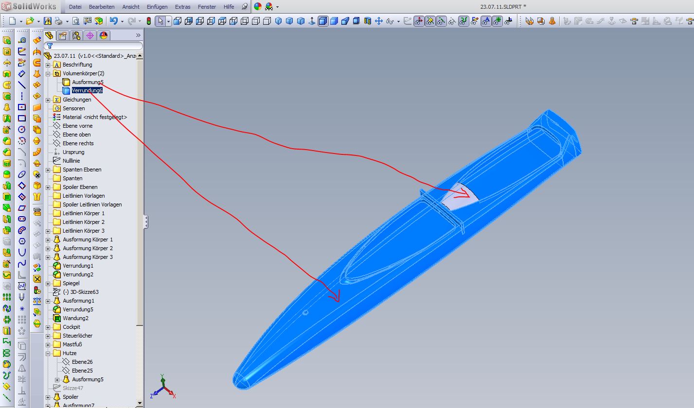 Hallo Flo, Ausformung 8 macht die Probleme! Ersetze sie durch eine Austragung mit Skizze 51 und Option Richtungsvektor Ebene Oben das aber mit der kompletten Konturübernahme in 3D Skizze 79 ! (Feature nicht spiegeln) Außerdem ist Deine Hutze Ausformung 5 ein einzelner Volumenkörper. Den solltest Du dringlichst mit dem Rest verbinden, sonst gibts nicht nur bei der nächsten Verrundung große Augen Grüße Andreas